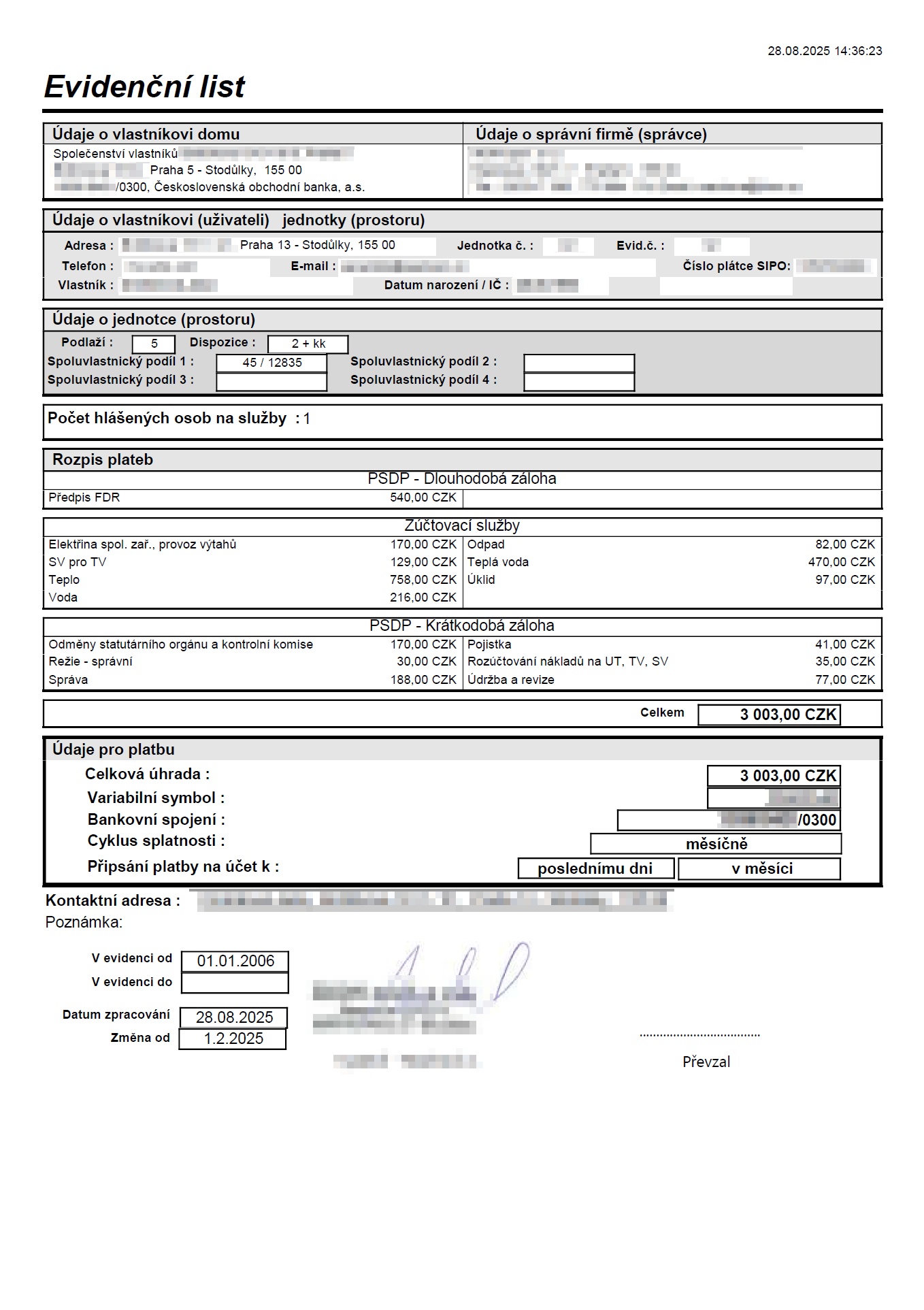Jde o dokument, který pravděpodobně máte. Vystavuje ho více či méně pravidelně SVJ (případně bytové družstvo) a obsahuje předpis zálohových plateb na služby, které každý měsíc hradíte. SVJ ho zasílá zpravidla při změně výše úhrad, není výjimkou, že každoročně, i když se úhrady nemění. Najdete na něm rozpad celkové měsíční úhrady na jednotlivé položky: záloha na vodu a teplo, úklid a osvětlení společných prostor, odměnu správci, předsednictvu či účetní firmě, náklady na provoz výtahu, ale také platbu do fondu oprav či krátkodobých záloh, platbu za společnou televizní anténu a další položky. Pokud SVJ pronajímá nějaké společné prostory, může se výnos z těchto pronájmů na Evidenčním listu také projevit jako plusová položka.