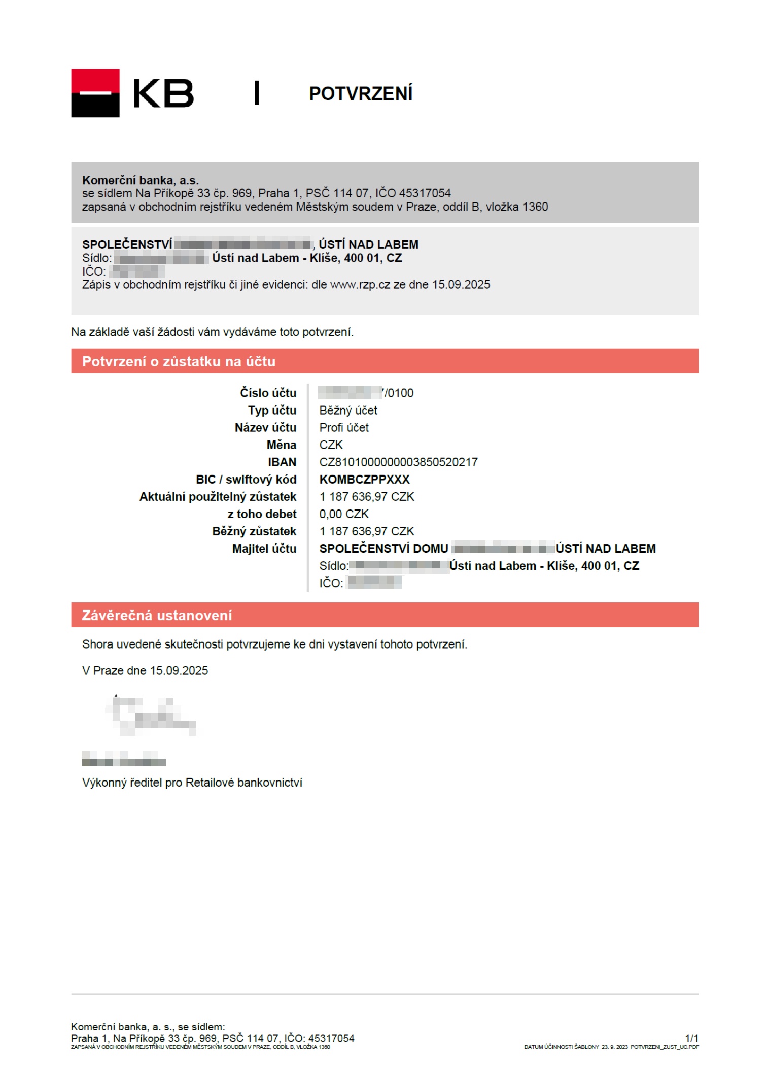 Potvrzení o výši zůstatku ve fondu oprav může být napsané buď volnou formou, nebo také výpisem či potvrzením z banky o saldu daného konta.
