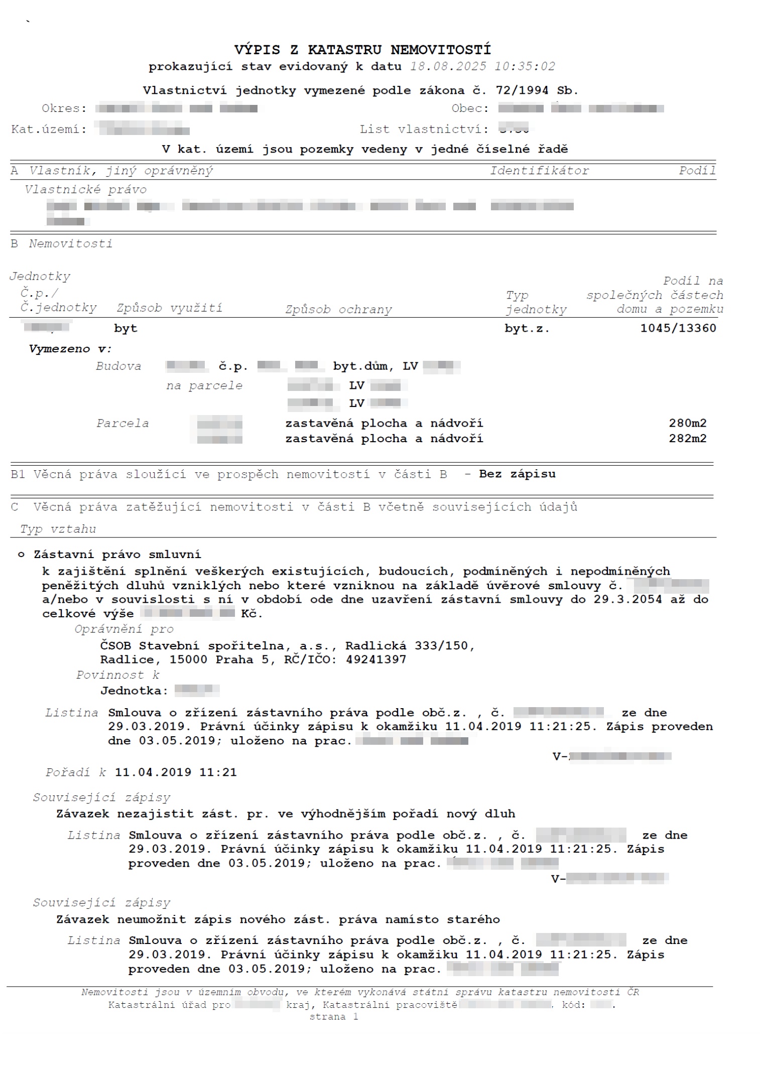 List vlastnictví, nebo také Výpis z katastru je základním dokumentem, kterým prokazujete vlastnictví nemovitosti a také je v něm obsaženo mnoho důležitých informací, které se k nemovitosti vážou – například omezení vlastnického práva z titulu zástav, věcných břemen a služebností, exekučních titulů a dalších právních vztahů, stejně jako oprávnění ve prospěch nemovitosti vůči jiným subjektům.