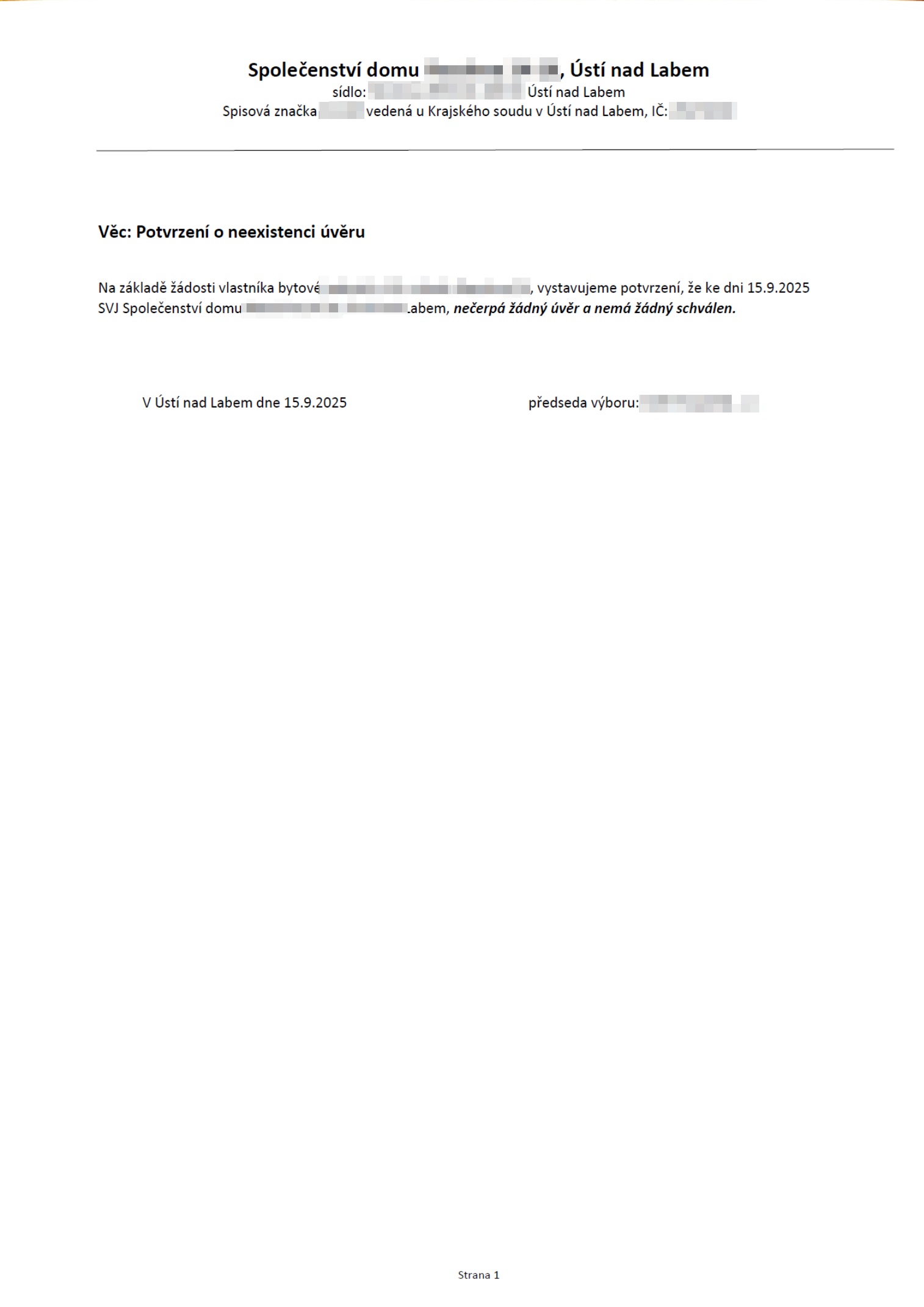 Má SVJ nějaký úvěr? Pokud ano, jak se to projevuje na výši měsíčních úhrad? Jaká je jeho aktuální (přibližná) výše? Jaký díl z této výše připadá na váš byt? To jsou otázky, které kupující často mívají a je třeba umět jim na ně odpovědět. A protože si nechceme takové informace vymýšlet, nebo z toho být nařčeni, je vhodné o takové info požádat přímo SVJ. Odpověď opět nemá konkrétní předepsanou formu.