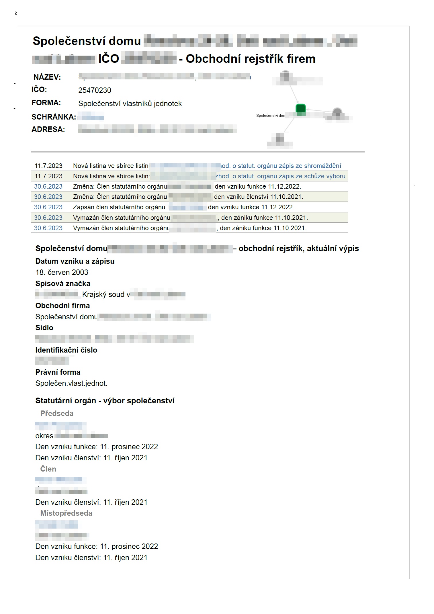 S touto položkou si lámat hlavu nemusíte v žádném případě, neboť si ji opatřím sám z veřejných rejstříků. Zde uvádím pouze pro úplnost. Z výpisu je patrné, kdo jsou členové výboru, kdo zastává funkci předsedy, místopředsedů, členů výboru jakou formou za SVJ jednají. Zároveň slouží výpis jako zdroj informací o SVJ jako právnické osobě – IČ, číslo datové schránky, sídlo, atd.
