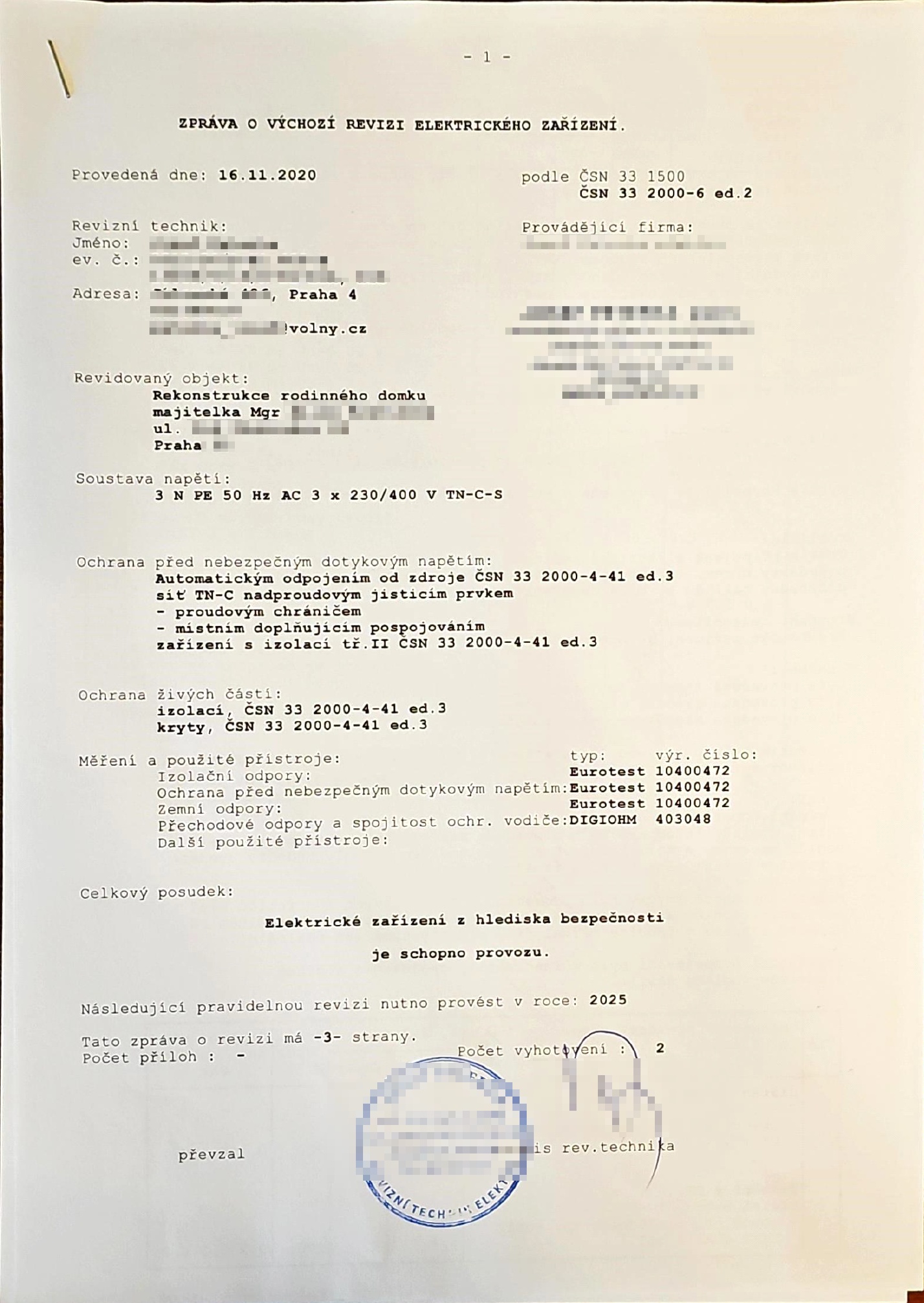 Pokud jste dočetli až sem a zatím vám z toho nepraskla hlava, máte mou velkou úctu. Revizní zpráva k elektroinstalaci není ze zákona povinná, ale může vám ušetřit mnoho starostí. Pokud ji budete mít přiměřeně čerstvou a revizní technik potvrdí, že je elektroinstalace v pořádku, máte v ruce solidní obranu proti případnému budoucímu nařčení ze skrytých vad v případě, že by se ukázalo, že je s elektrickou soustavou cosi v nepořádku. Tento bod tedy neberte jako nutnost, jen jako mé doporučení, zejména pokud hrozí, že by taková situace mohla nastat. Seznam certifikovaných techniků přikládám.