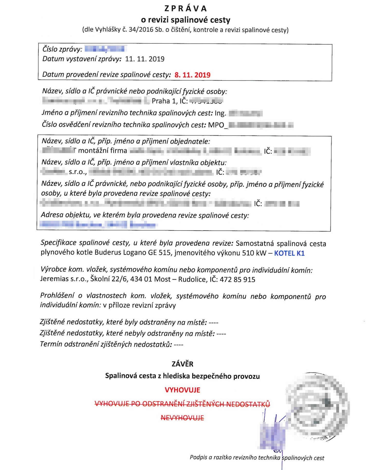 To samozřejmě platí pouze ve chvíli, kdy v bytě máte plynový kotel (či velmi nepravděpodobně kotel na pevná paliva) a tím pádem i komínový svod. V takovém případě máte povinnost v pravidelném intervalu dvou let (1 roku v případě sezónního vytápění pevnými palivy a 2x ročně v případě, že je kotel na pevná paliva hlavním zdrojem tepla) provádět revizi. Revizní technik (kominík) vám vydává revizní zprávu a tu následně předložíme zájemcům.