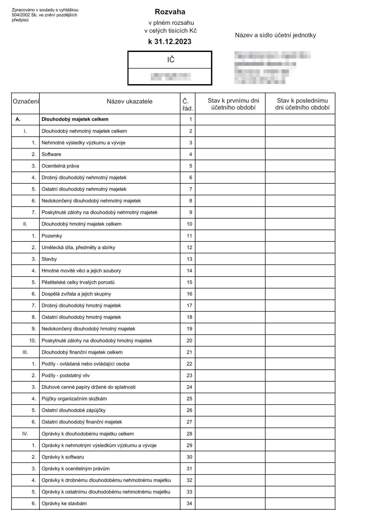 j) Rozvaha nebo Výkaz zisků a ztrát SVJ za poslední účetní období (rok)