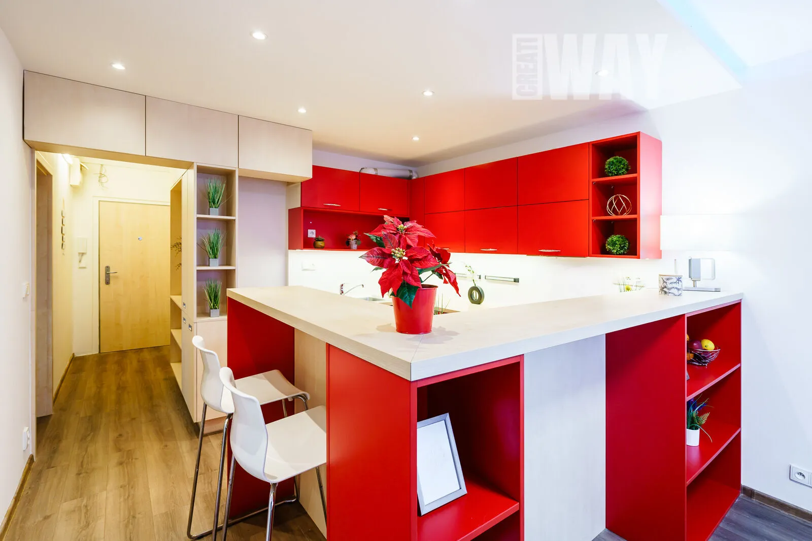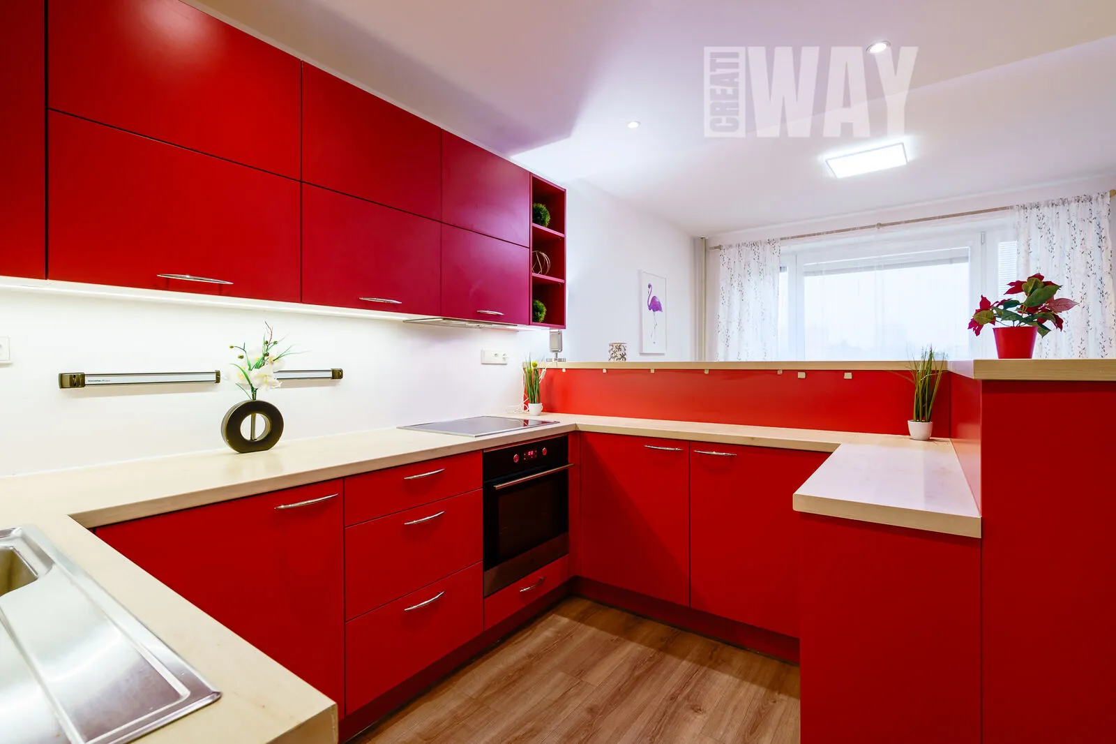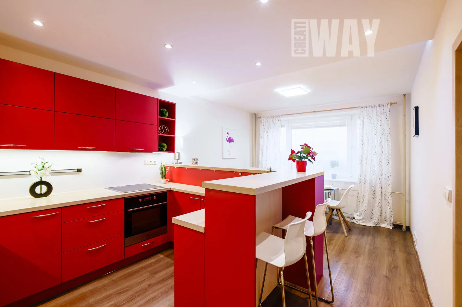 Vaříte rádi? Tak to potřebujete pořádnou kuchyň. Jednu pro vás mám a okolo ní je vystavěný docela fajn byt 3+kk. Kuchyň samotná je opravdu Ferrari mezi kuchyněmi. A to nejen barvou, ale i výbavou a velikostí. Mimo veškerých spotřebičů, které byste v takové kuchyni čekali, jako je myčka, horkovzdušná trouba, varná deska, digestoř, tady najdete i praktický barový pult. A je úplně jedno, jestli ho budete používat na servírování večeří pro rodinu, nebo po něm posílat míchané drinky, když si pozvete přátele. Nad barem v podhledu si můžete zablikat barevnými ledkami a párty může začít.