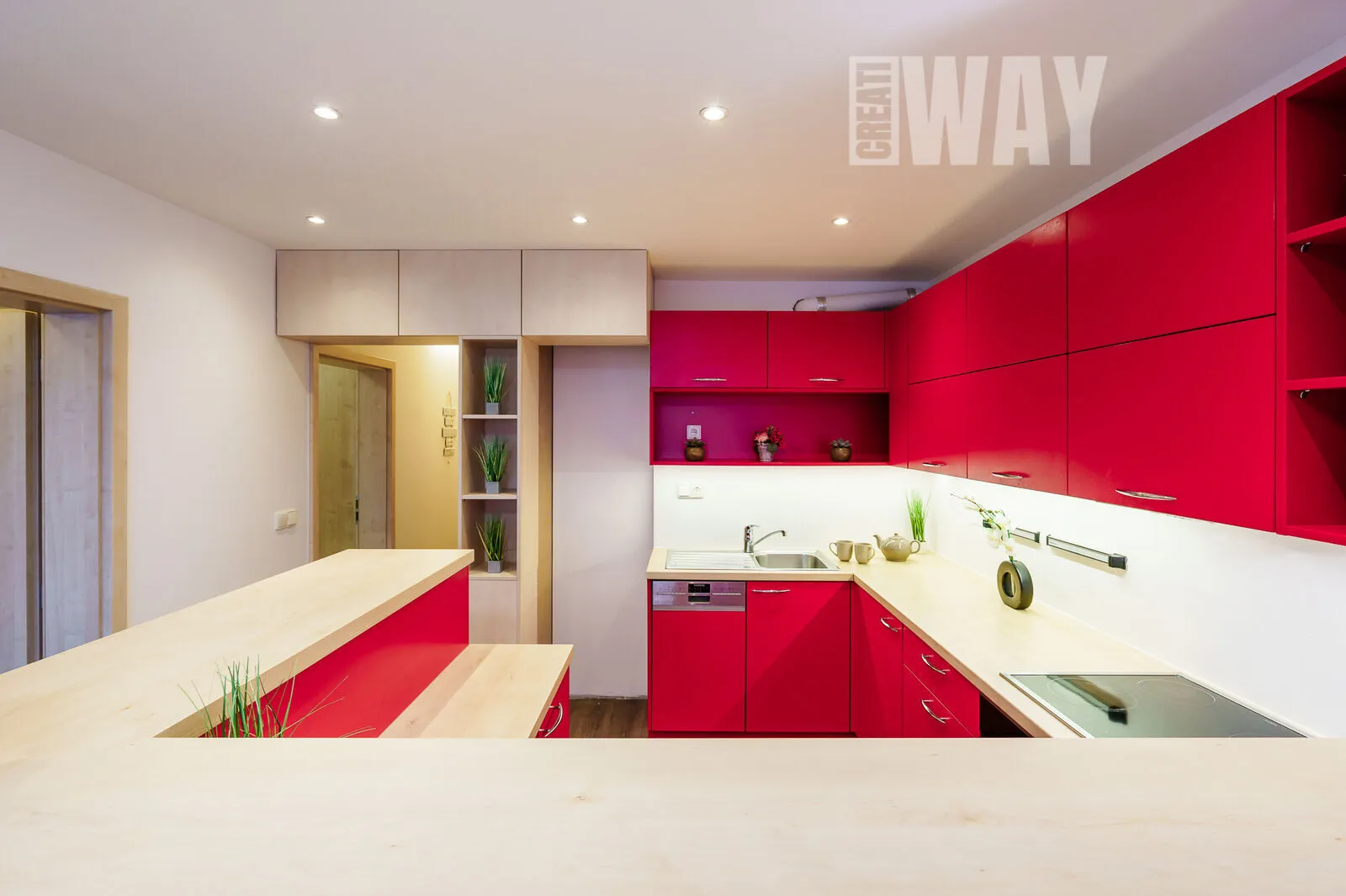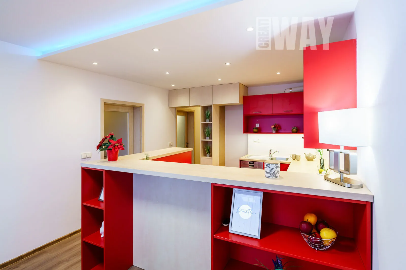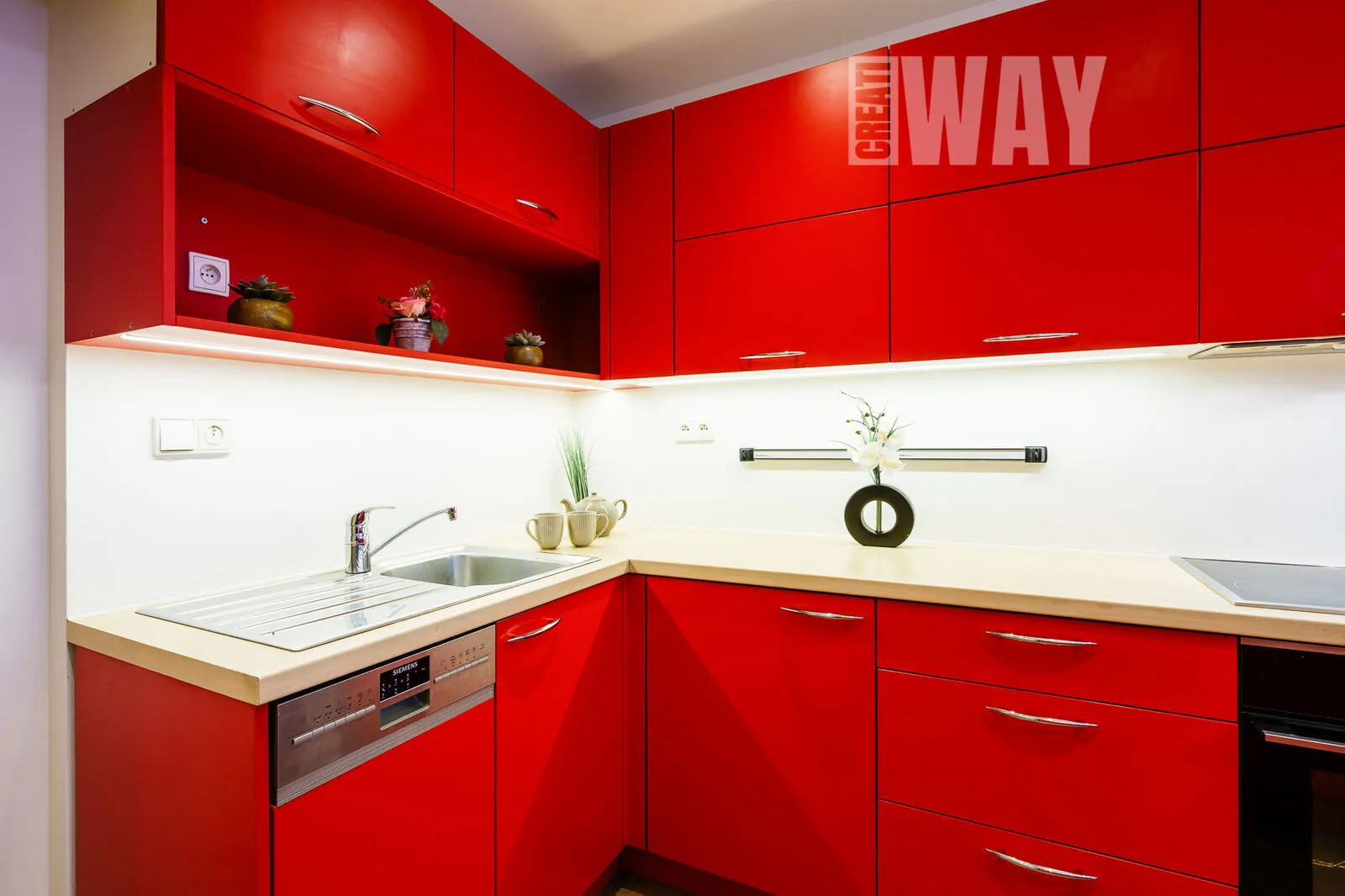 Vaříte rádi? Tak to potřebujete pořádnou kuchyň. Jednu pro vás mám a okolo ní je vystavěný docela fajn byt 3+kk. Kuchyň samotná je opravdu Ferrari mezi kuchyněmi. A to nejen barvou, ale i výbavou a velikostí. Mimo veškerých spotřebičů, které byste v takové kuchyni čekali, jako je myčka, horkovzdušná trouba, varná deska, digestoř, tady najdete i praktický barový pult. A je úplně jedno, jestli ho budete používat na servírování večeří pro rodinu, nebo po něm posílat míchané drinky, když si pozvete přátele. Nad barem v podhledu si můžete zablikat barevnými ledkami a párty může začít.