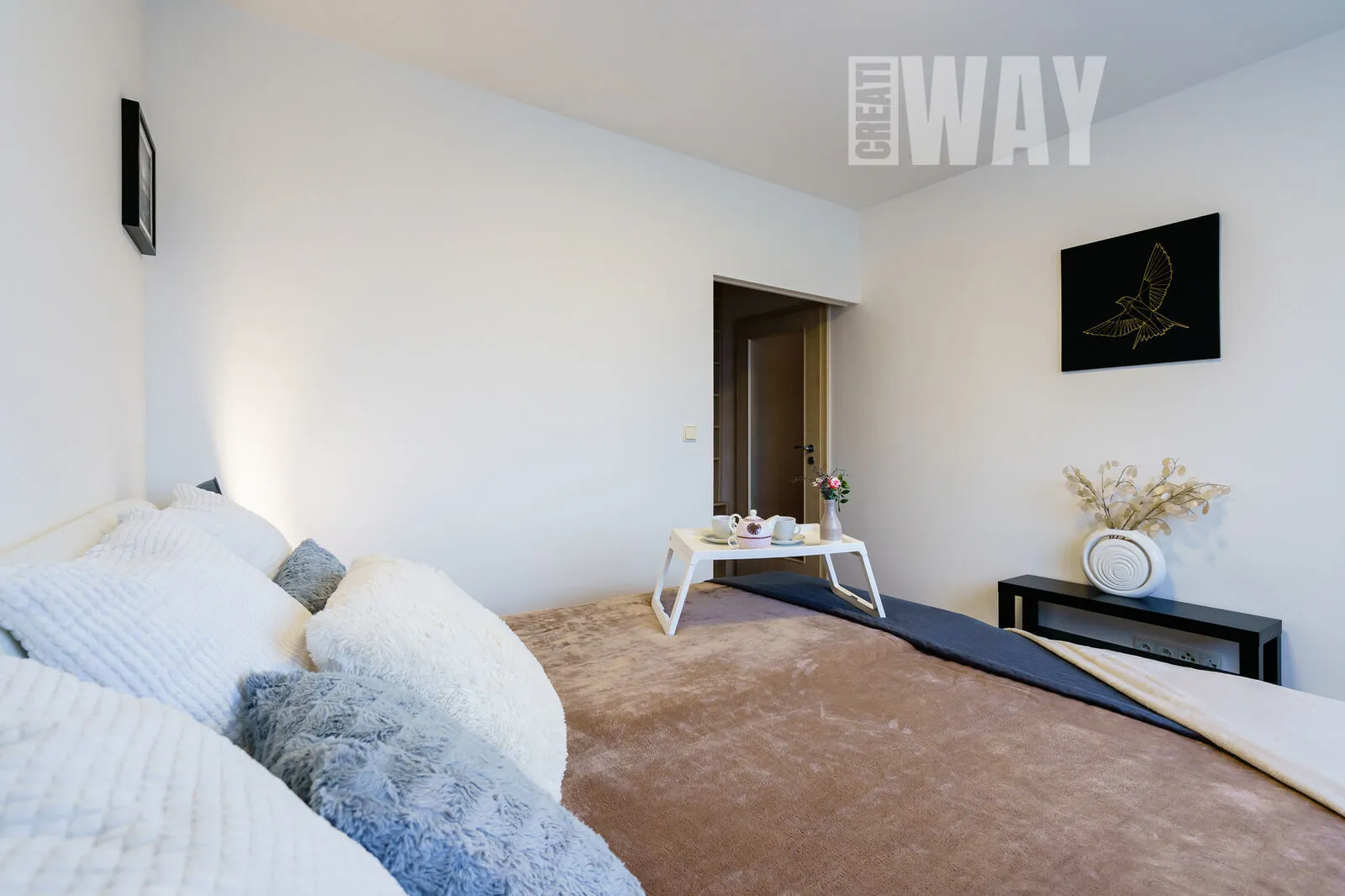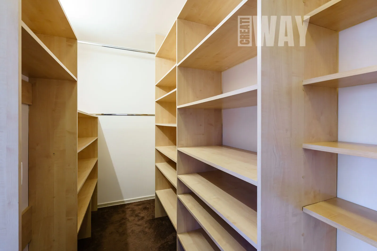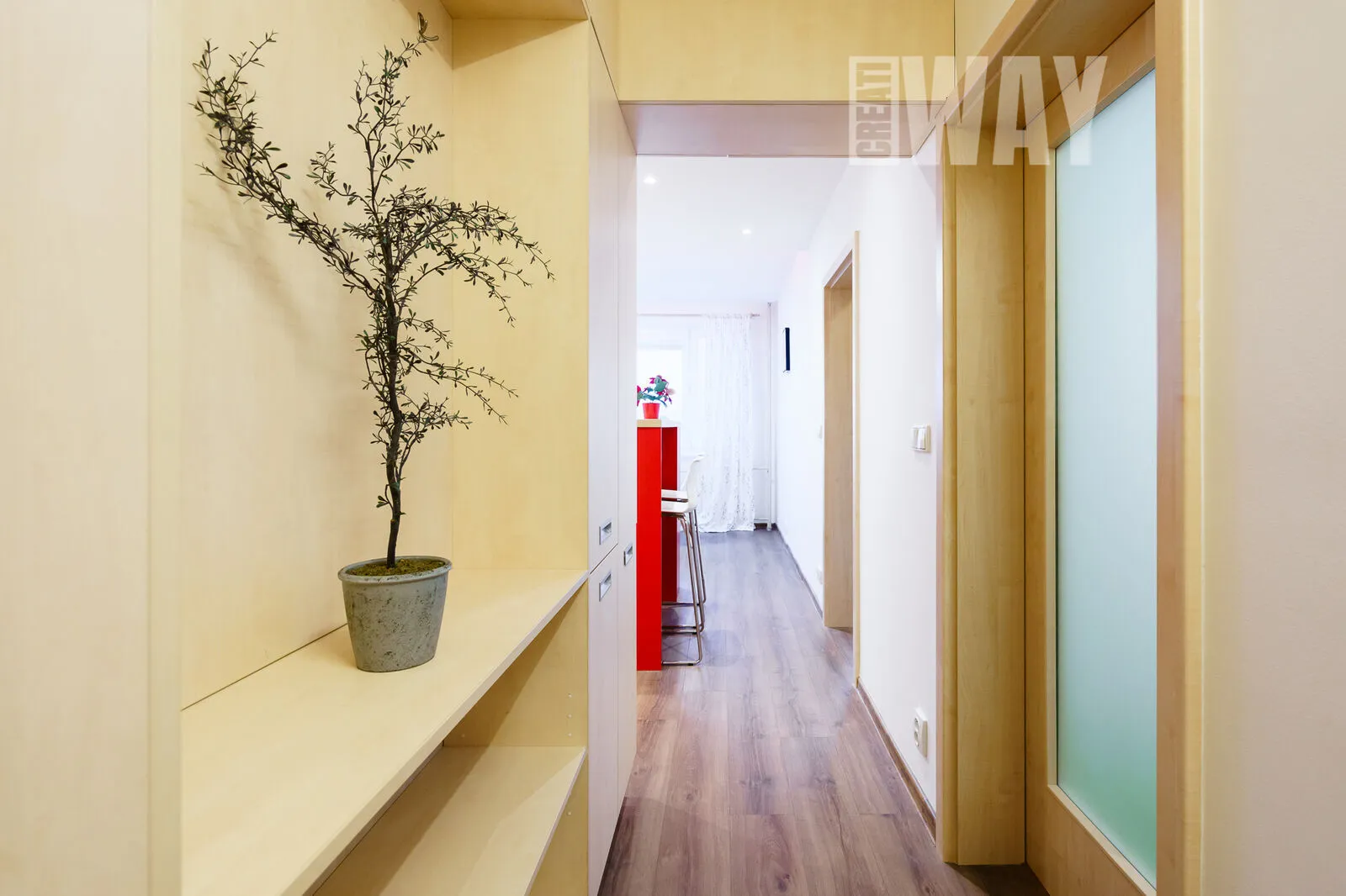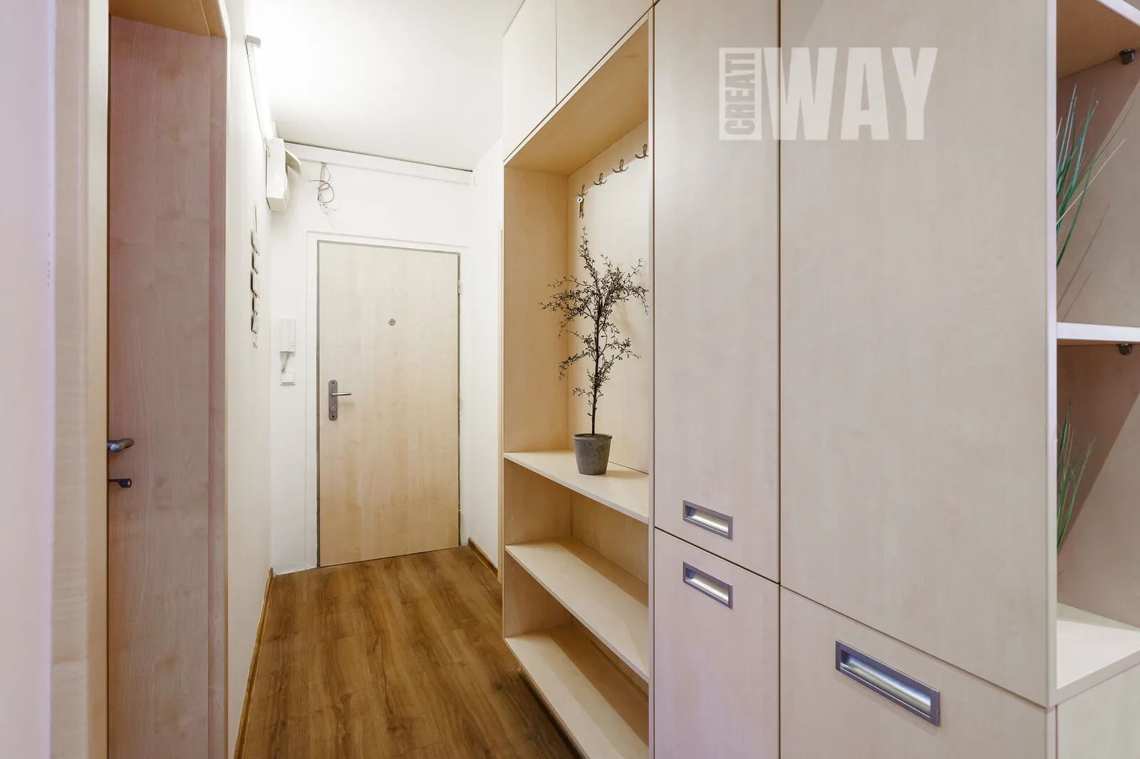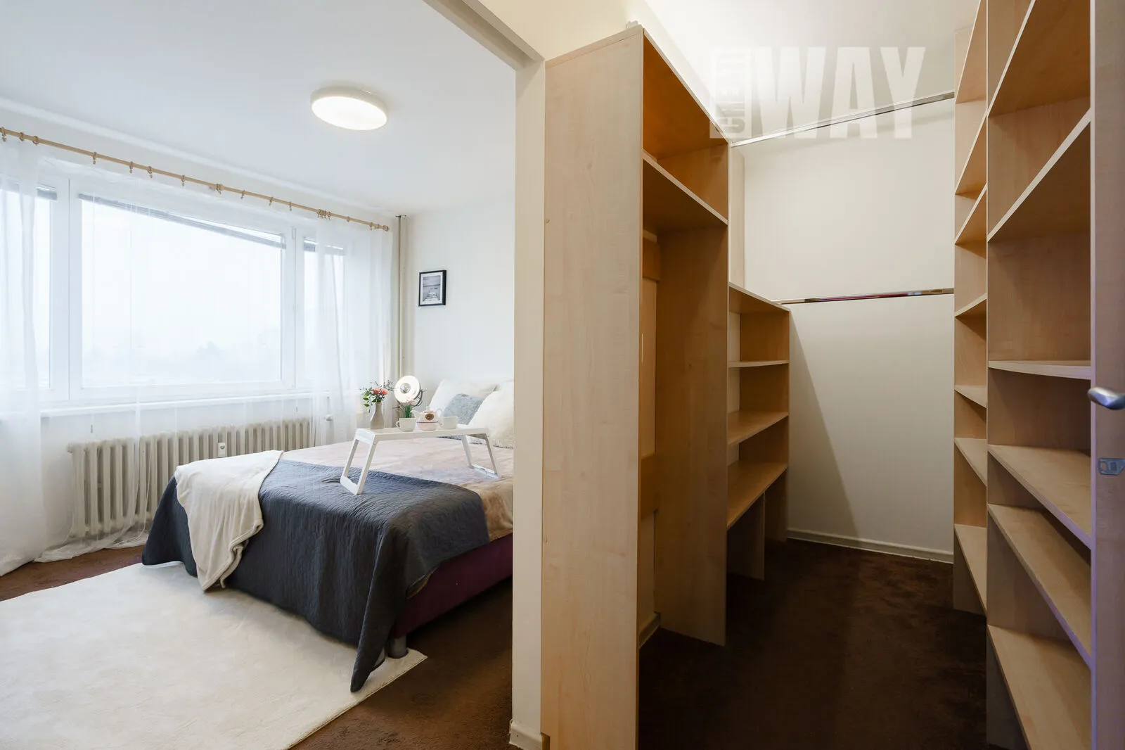 Současní majitelé v rámci rekonstrukce celého bytu provedli několik zajímavých změn, z nichž ta nejvýraznější je zároveň velmi praktická. Dvě původní ložnice byly skoro zbytečně velká, tak je přepažili sádrokartonovou stěnou a každý pokoj tak získal vlastní nezanedbatelně prostornou šatnu. V šatnách najdete police a do nich naskládáte opravdu úplně vše, co vás napadne. Další úložný prostor najdete v chodbě v podobě šatní stěnové skříně, která je chytře napojená přímo na kuchyňskou linku. A pokud byste i přesto potřebovali další úložné prostory, o dvě patra níže najdete sklepní kóji.