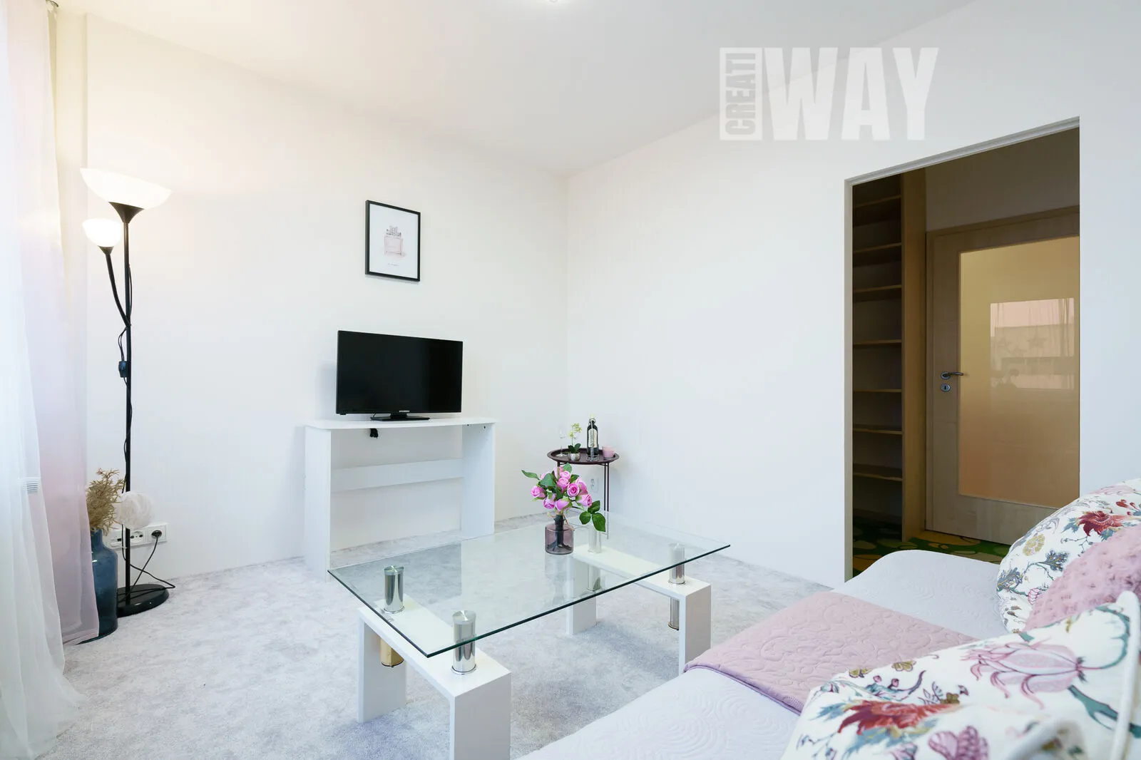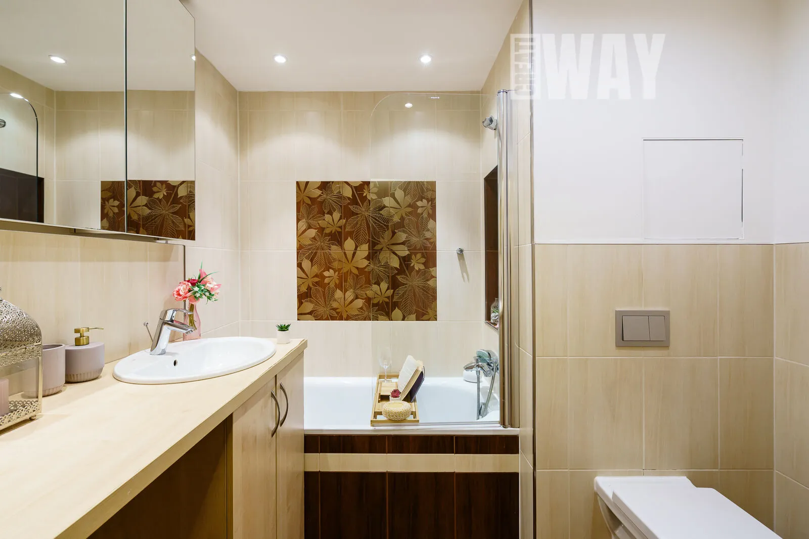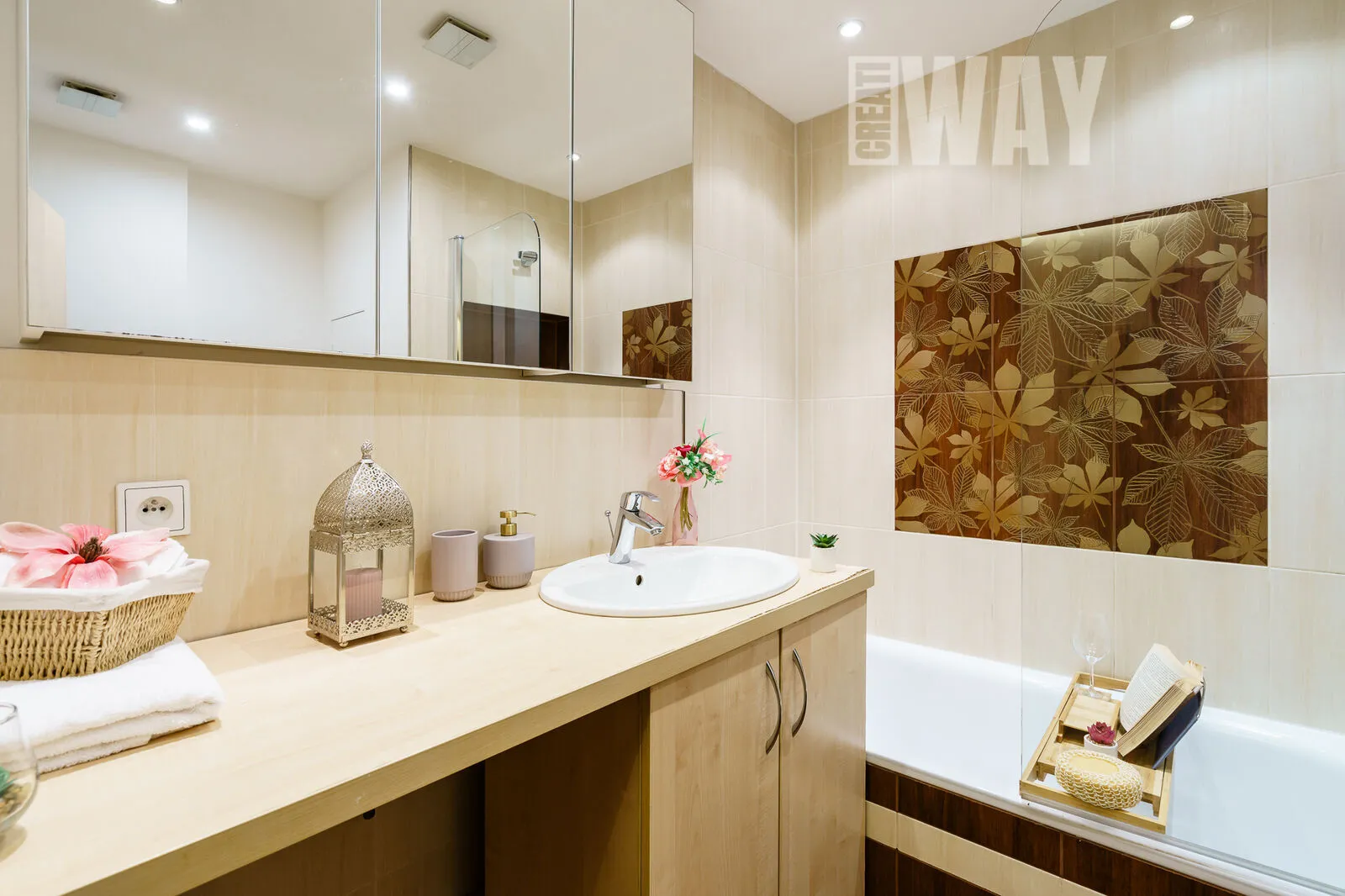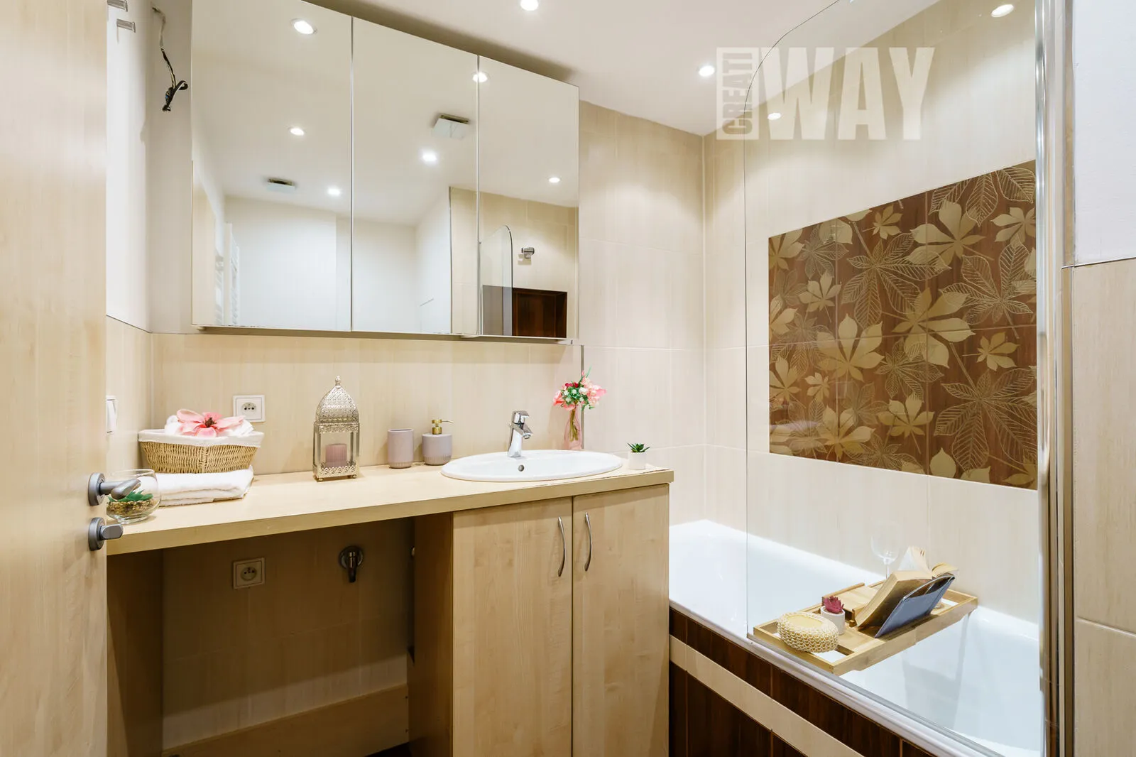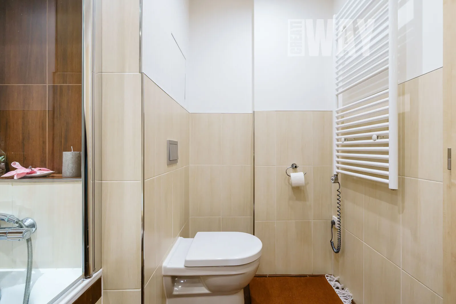 V koupelně najdete vanu, toaletu, prostor na pračku, ideálně kombinovanou se sušičkou. Prádlo můžete sušit nad vanou, ale pokud mám zmínit jedinou nevýhodu tohoto bytu, tak lodžii u něj nenajdete.