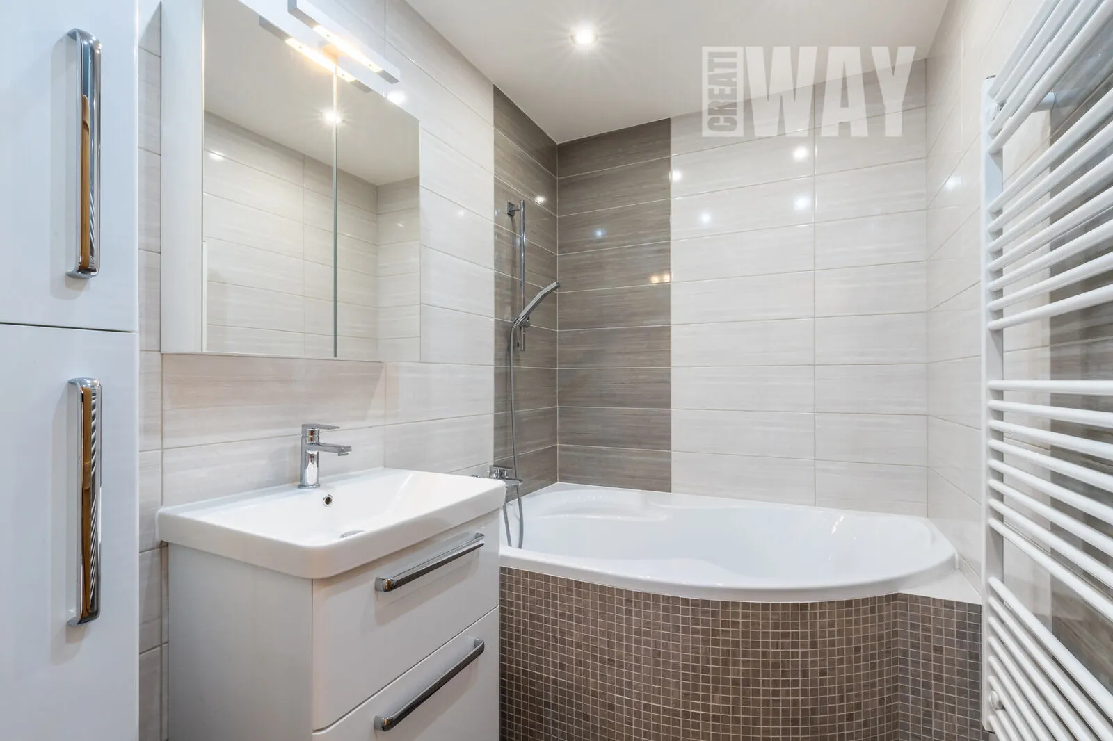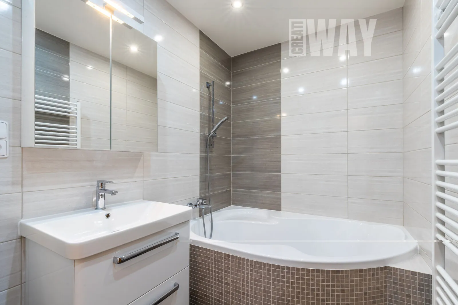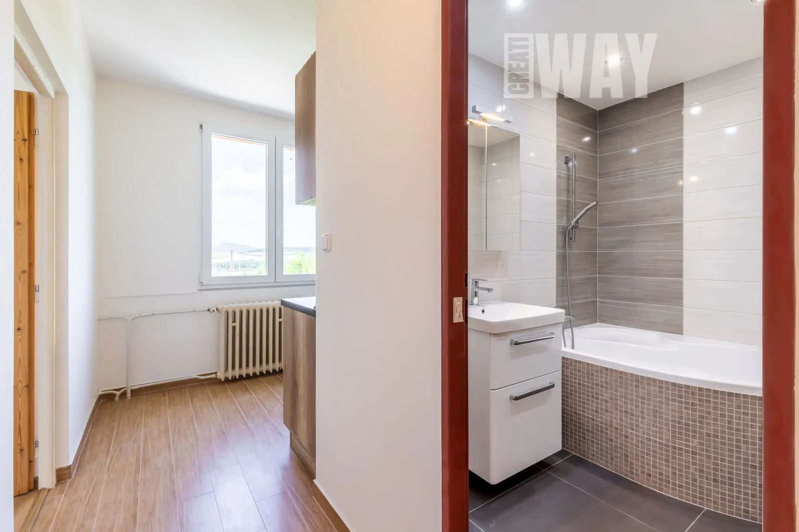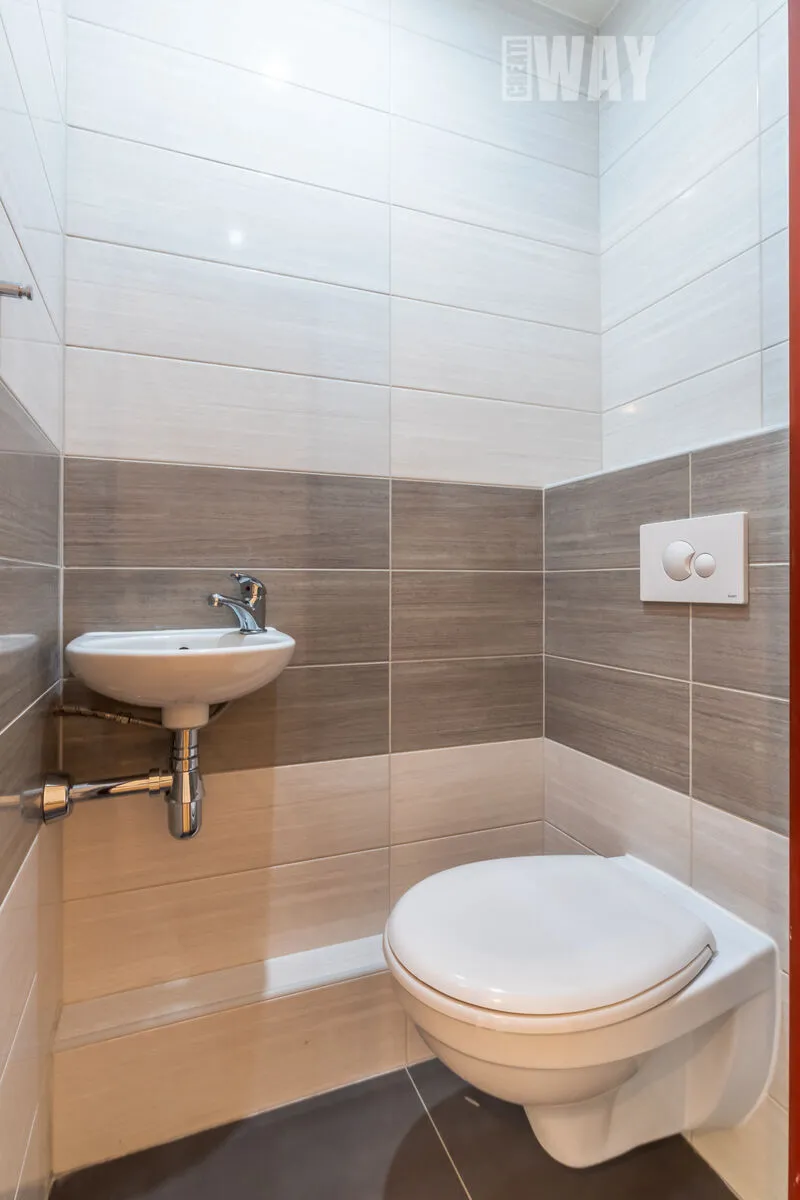 Byt je opravdu vkusně zrekonstruovaný. Má nové jádro, koupelna je z ytongu a obložená vkusnou kombinací krémovo-šedých obkladů, je v ní rohová vana a i prostor na pračku a sušičku. Toaleta je samostatná a je provedena ve stejném dekoru.