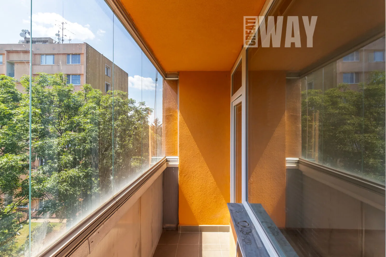 Z obývacího pokoje je vstup na lodžii, která je stejně jako byt po rekonstrukci, má položenou dlažbu a vnější fasáda je také vkusně obnovená, osatně jako na celém domě.