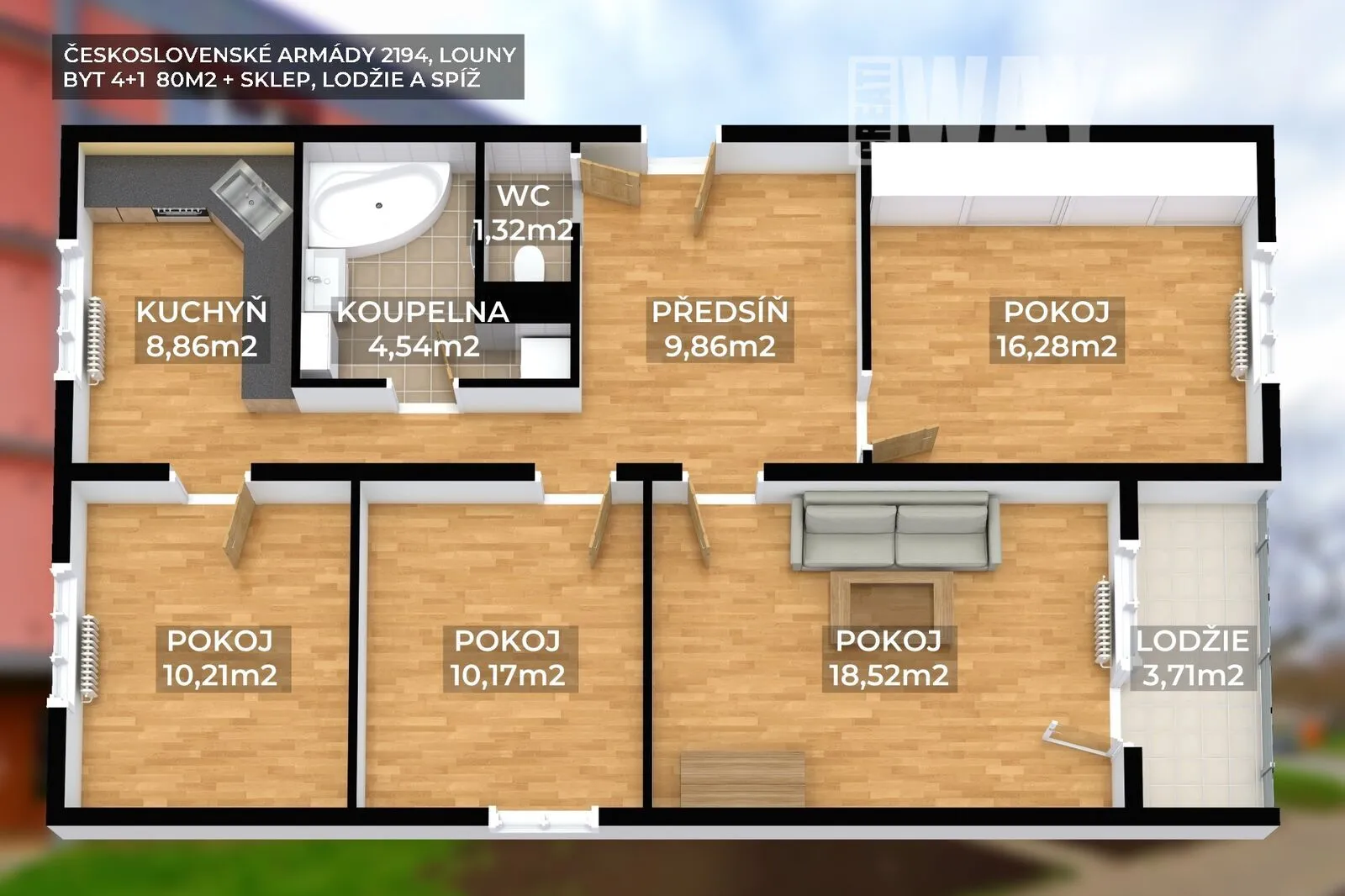 Pěkně zrekonstruovaný byt s 80m2 podlahové plochy, ve kterém najdete 4 samostatné pokoje, kuchyň, pěknou koupelnu s rohovou vanou a samostatné WC. Navíc to doplňte lodžií, velký sklepem a komorou v mezipatře a máte přibližnou představu, co vám dneska chci nabídnout.