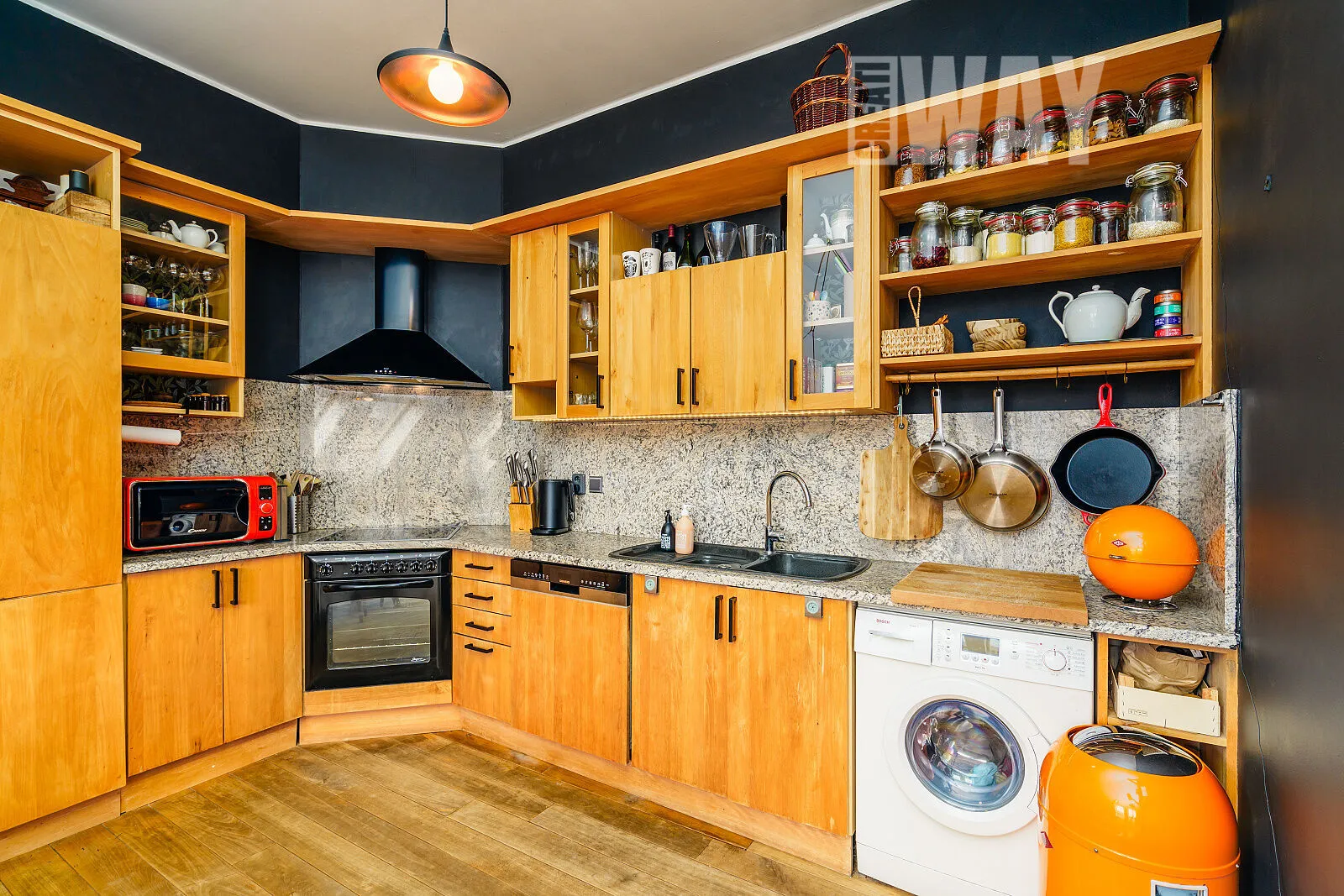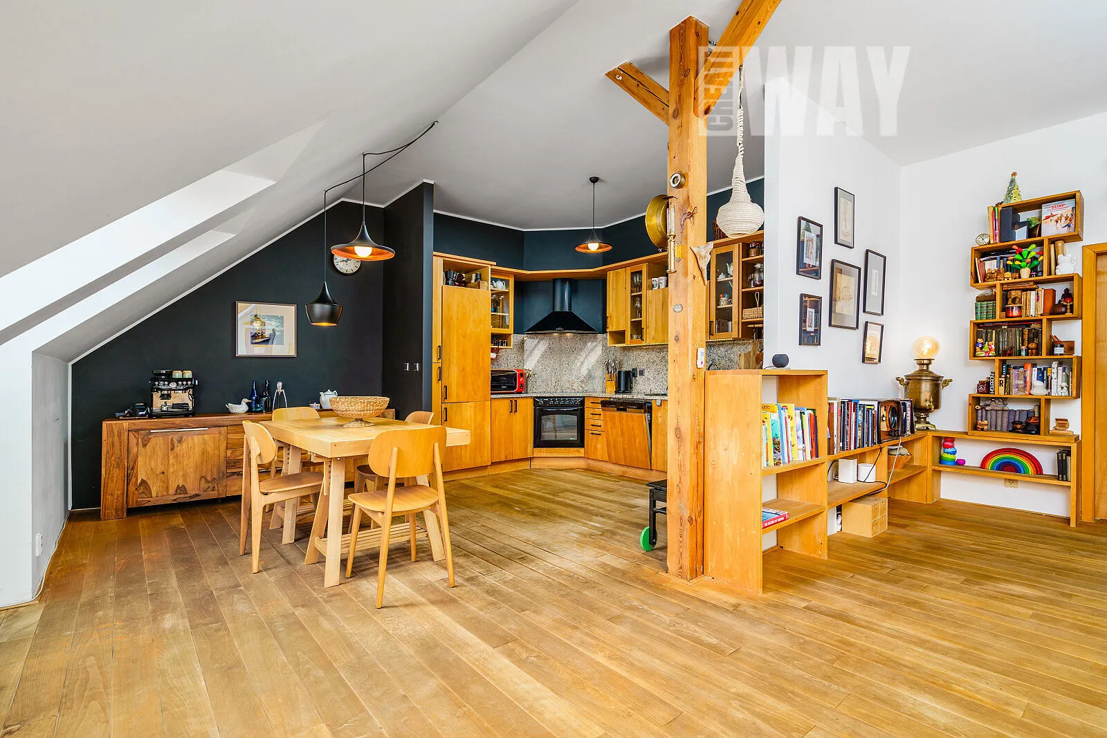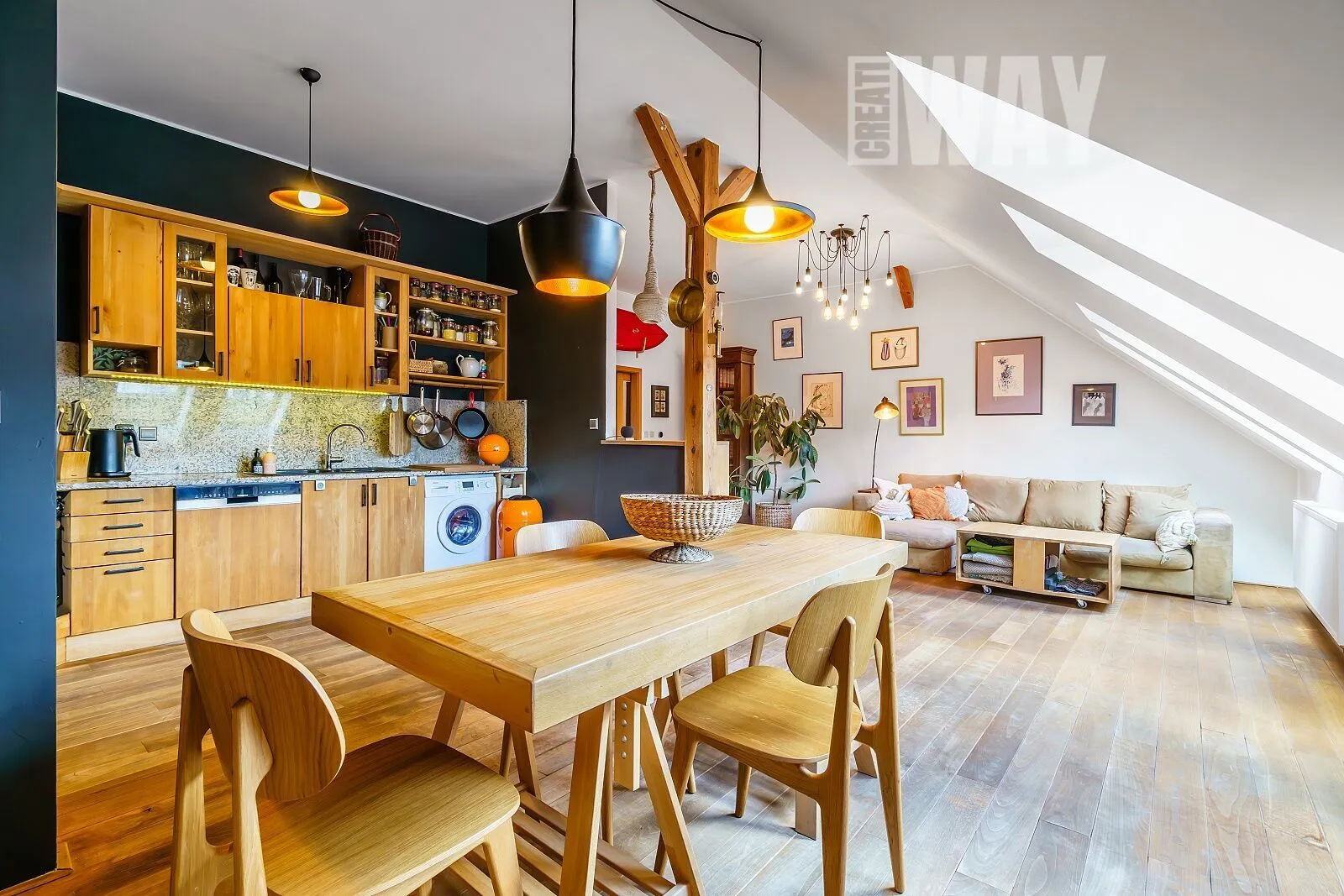 Ve spodní části dvoupatrového bytu najdete prostorný obývací pokoj s navazující kuchyní. Ta je plně vybavená moderními spotřebiči a svým stylem zcela respektuje náladu bytu. Kulinářská kouzla, která zde předvedete, budou zaručeně ještě o stupínek lepší a chutnější, než by tomu bylo kdekoliv jinde.