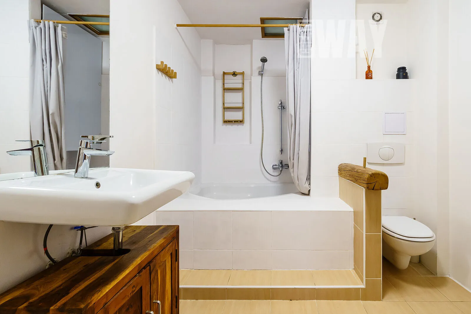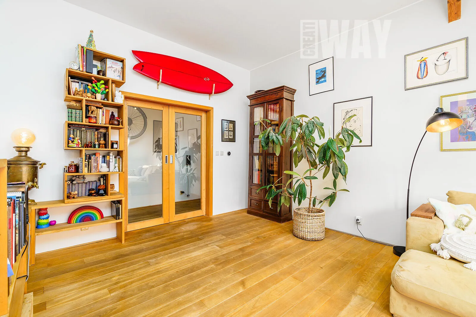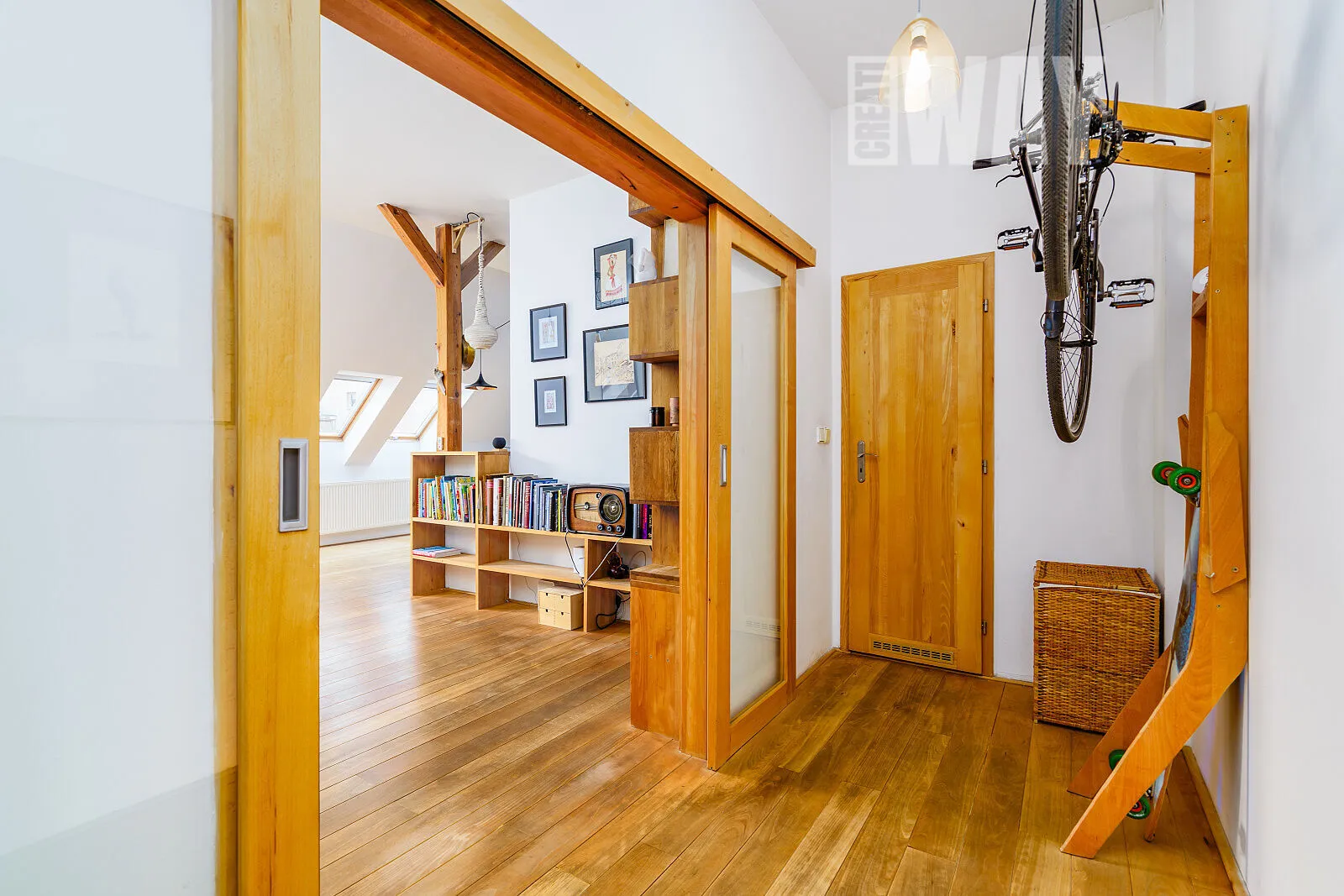 Hned jak projdete vstupními dveřmi, tak se ocitnete uprostřed Art de Vivre. Lehký, vzdušný, ale přitom tak plný života. Bytu vévodí dřevo, které najdete na podlahách, v přiznaných sloupech, dřevěné jsou dveře se zárubněmi a samozřejmě se sem bude i nejvíc hodit váš dřevěný nábytek. Současní majitelé ducha tohoto bytu pochopili a rozvinuli, takže se jimi můžete inspirovat, případně vtisknout tomuto prostoru zcela vlastní otisk.