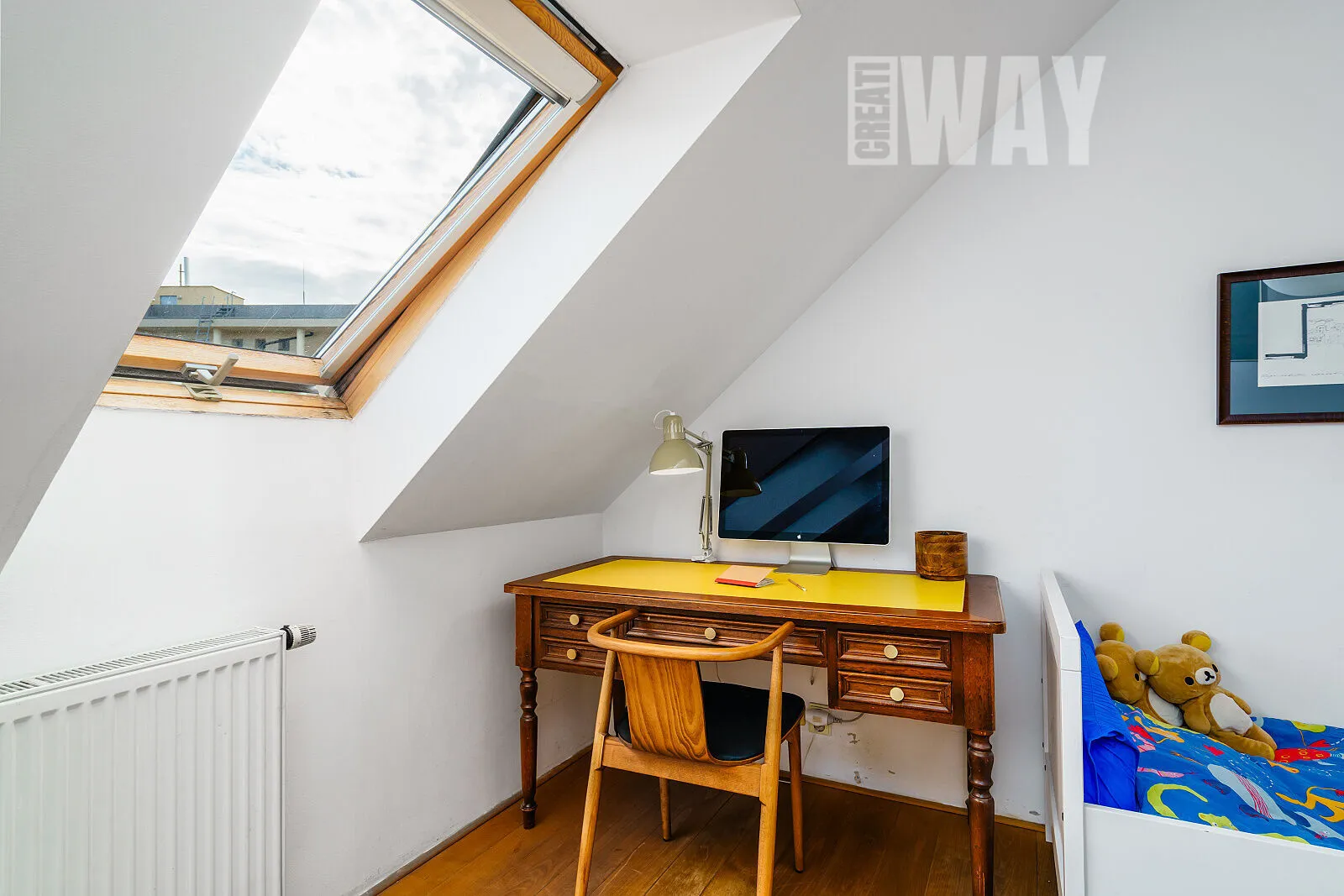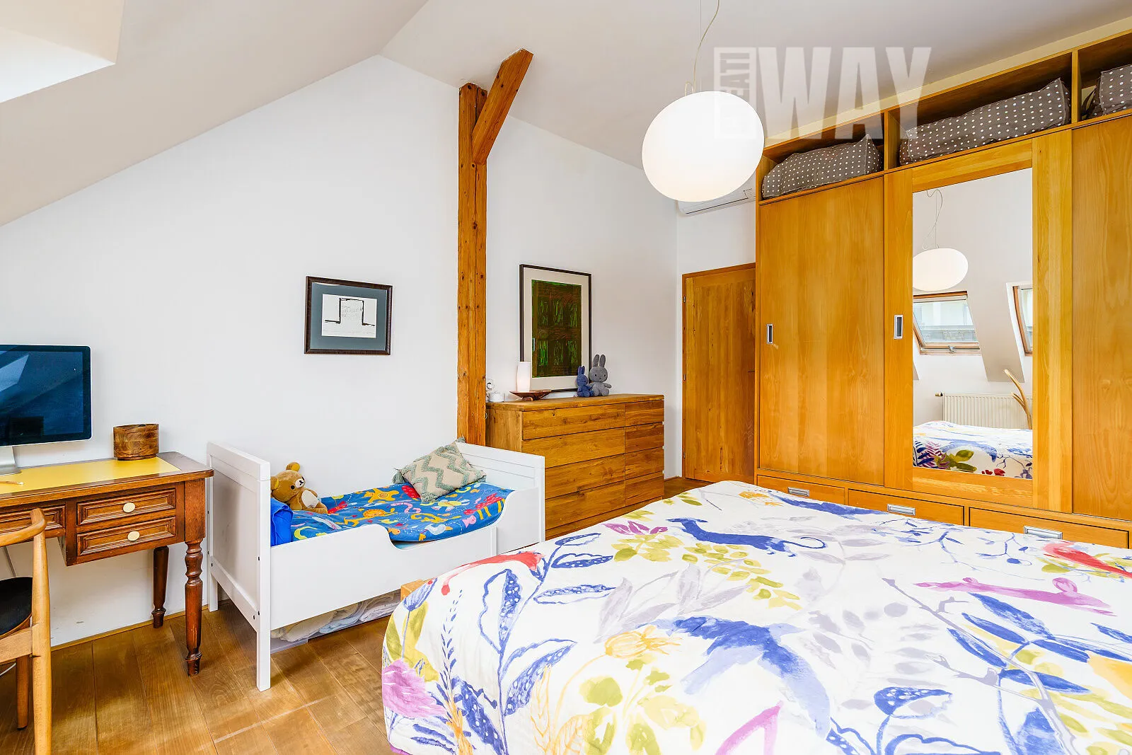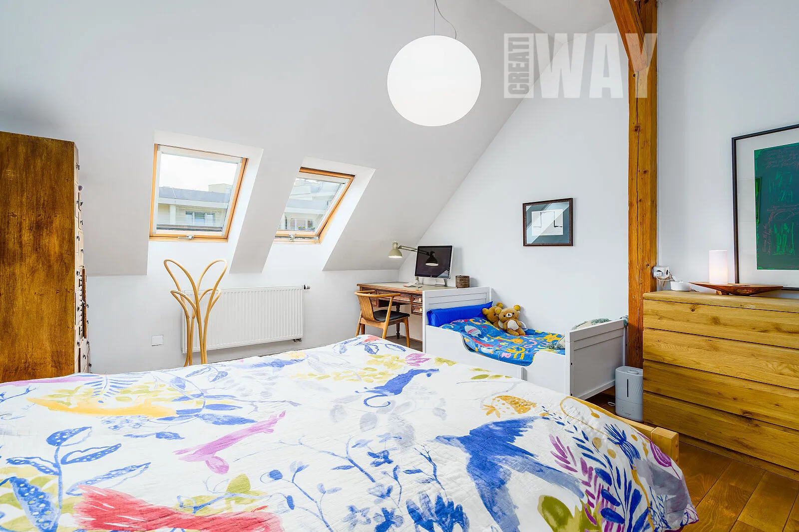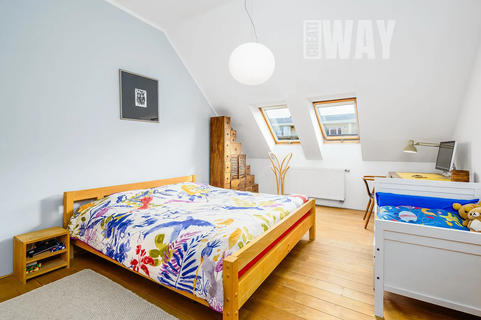 V bytě najdete celkem tři ložnice – jedna z nich je ve spodní části, dvě nahoře. Jsou příjemně velké, vzdušné a světlé, díky střešním oknům věčně zalité sluncem.
