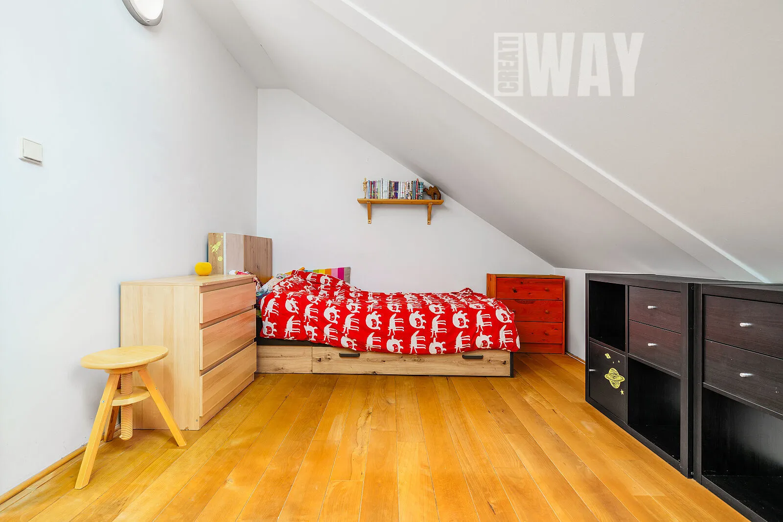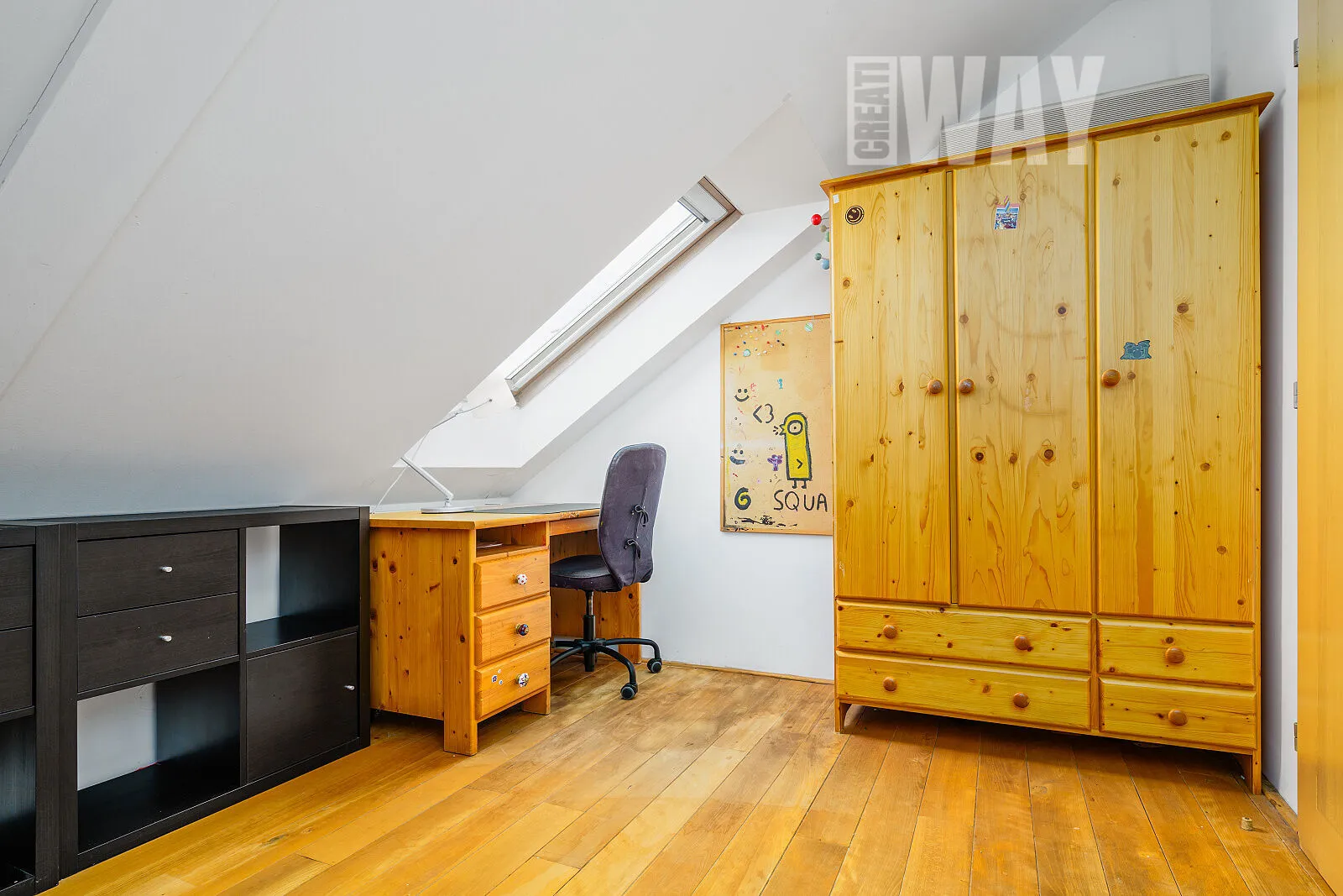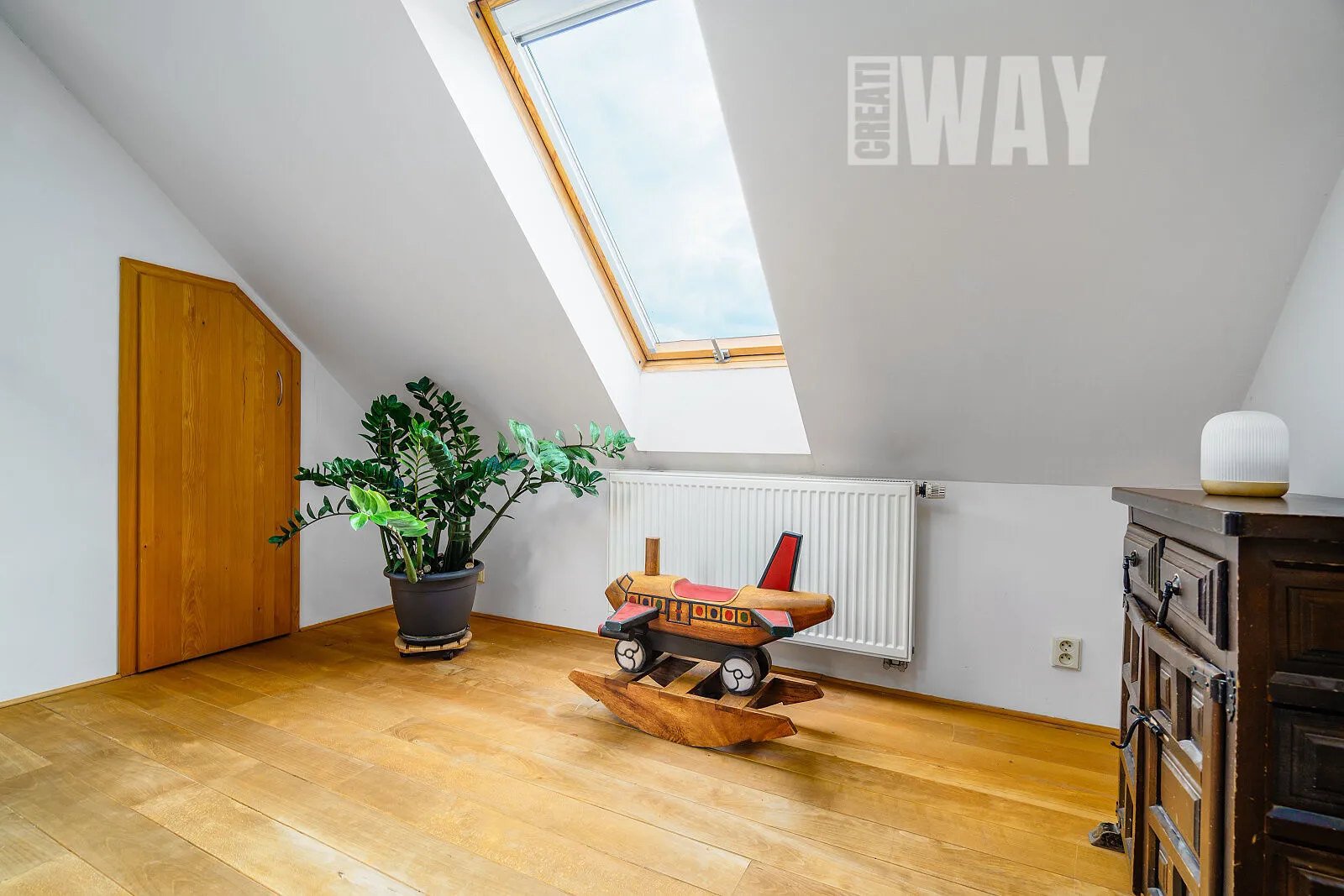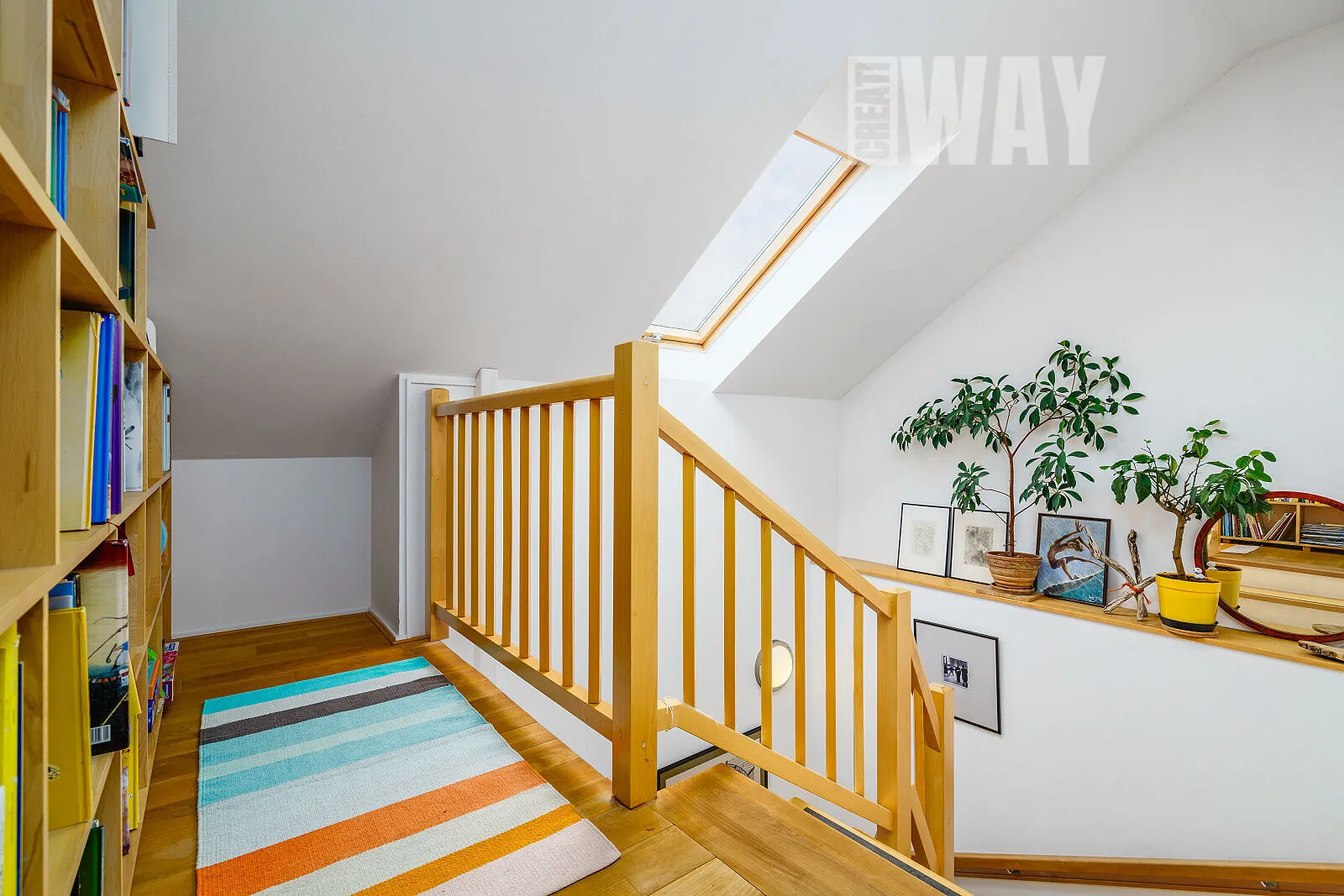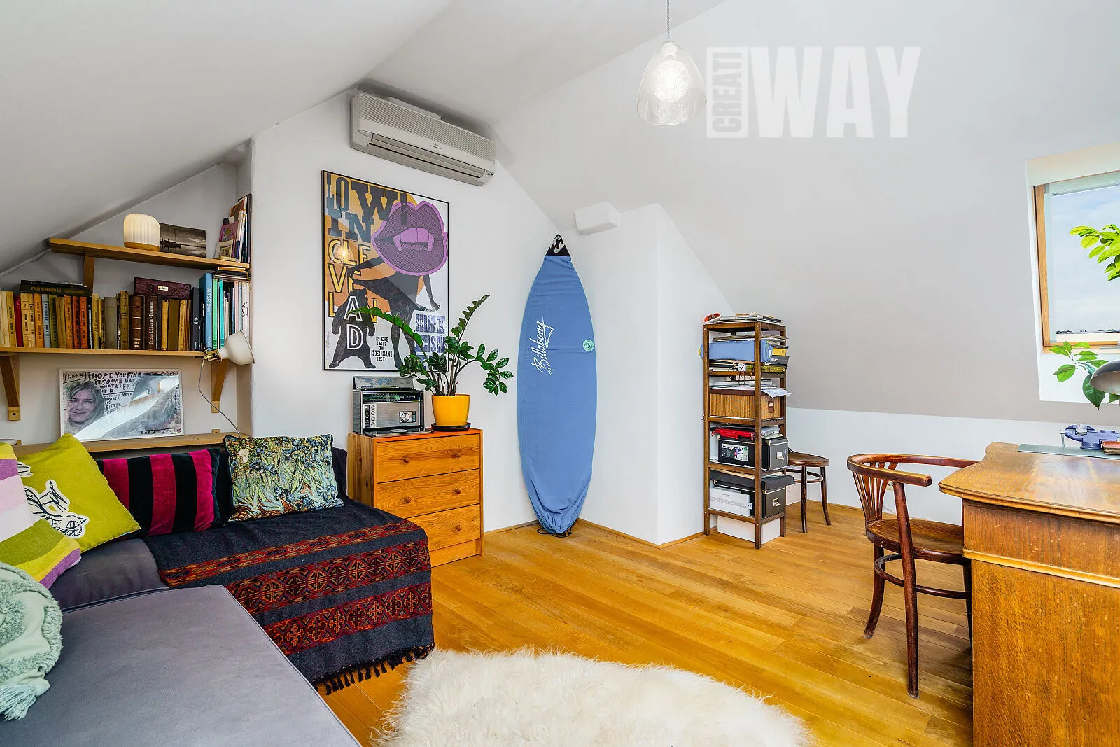 V bytě najdete celkem tři ložnice – jedna z nich je ve spodní části, dvě nahoře. Jsou příjemně velké, vzdušné a světlé, díky střešním oknům věčně zalité sluncem.