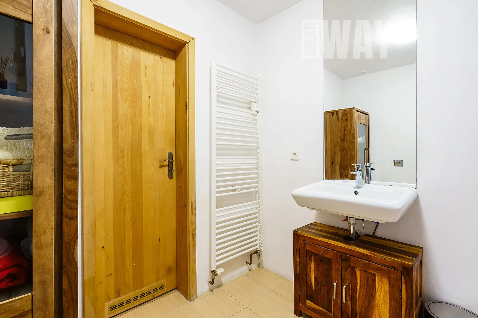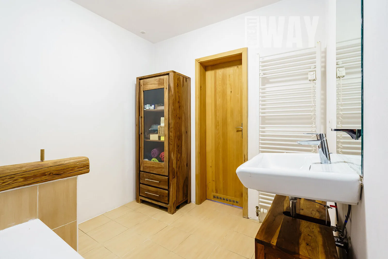 V koupelně najdete velkou pohodlnou vanu a ani tady nechybí krásné dřevěné prvky.