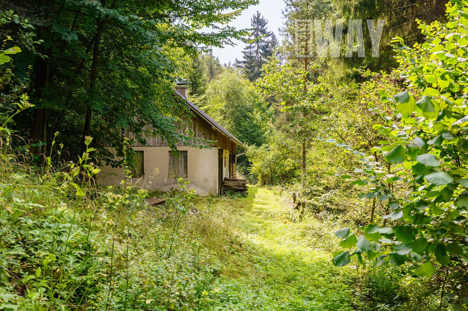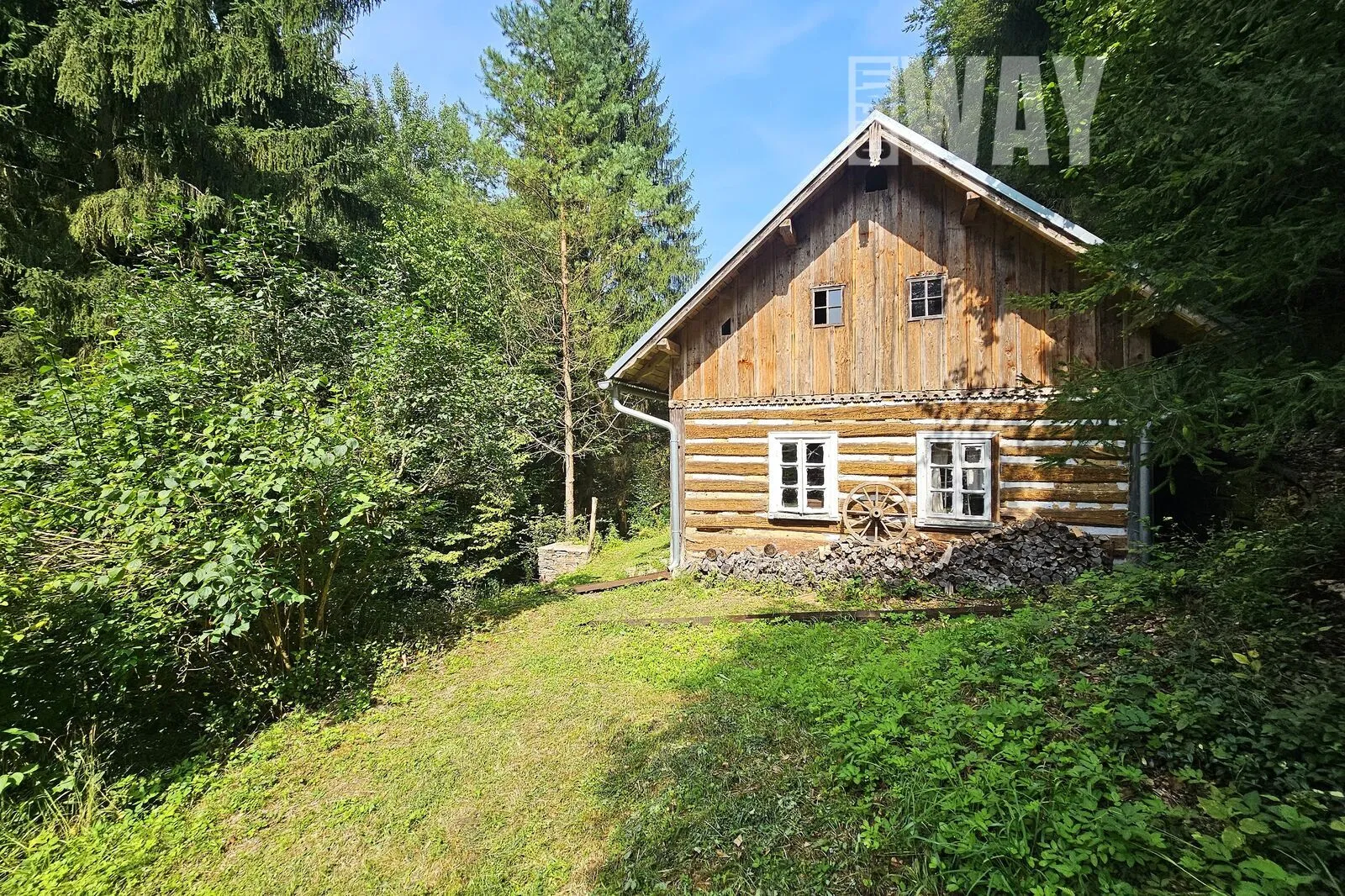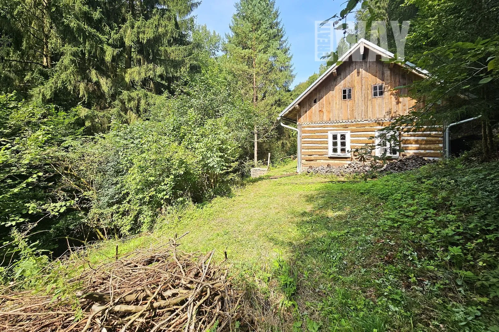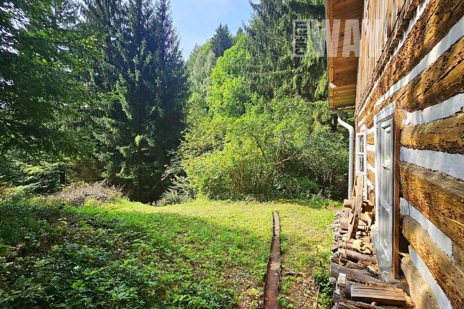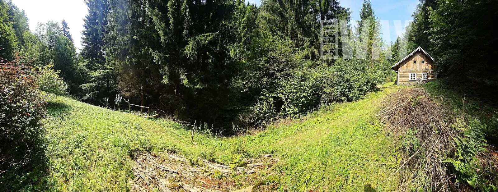 FAKT: Pozemek je z 90% zalesněný a svažitý. Součástí pozemku nejsou žádné louky, jediná mýtina je okolo roubenky.
