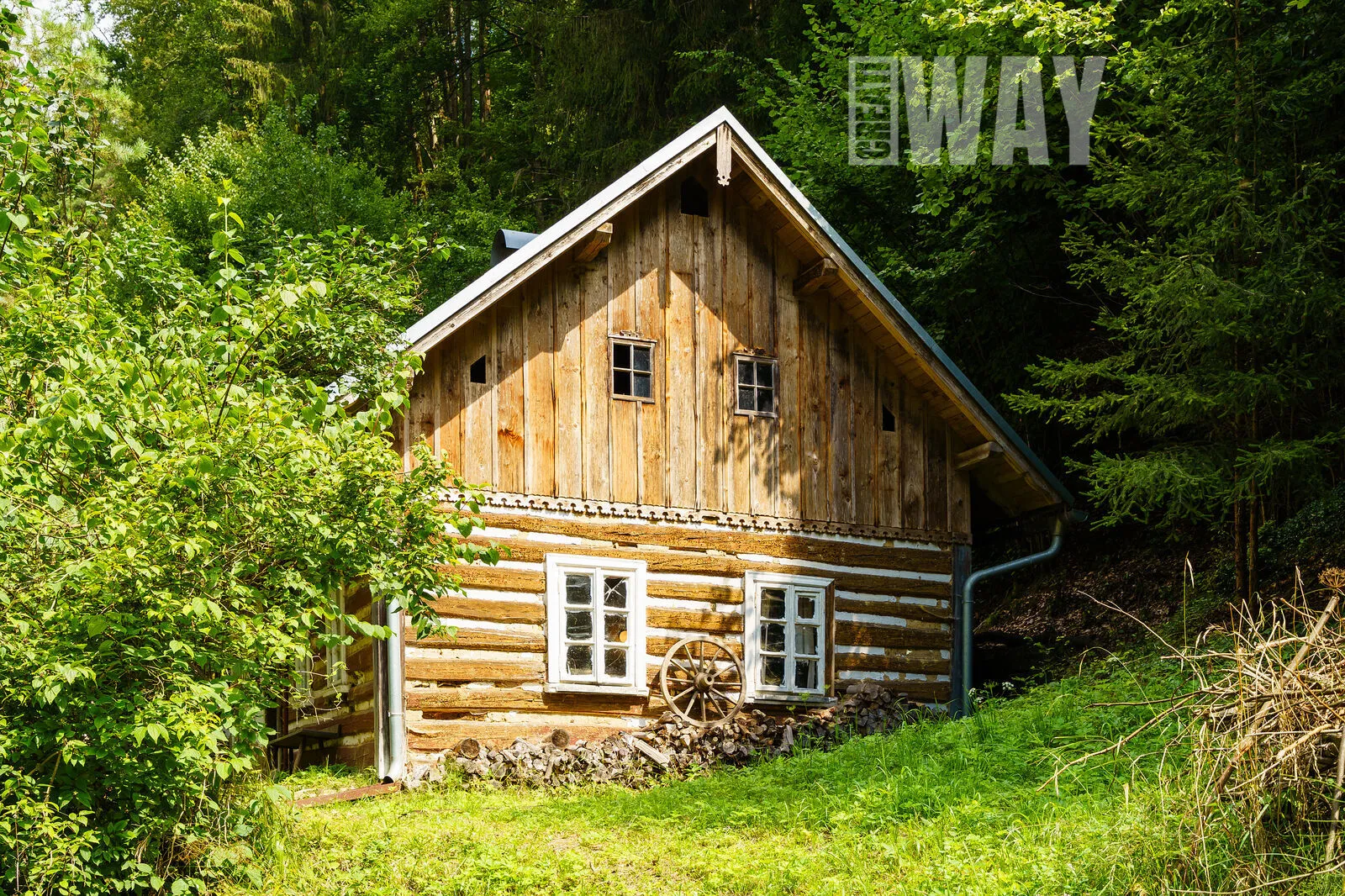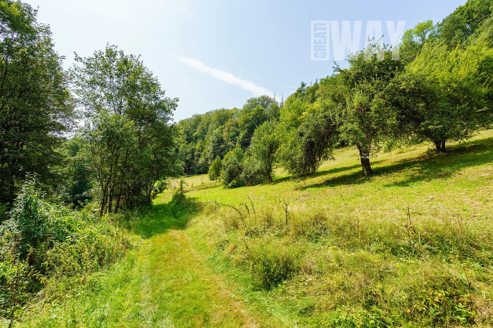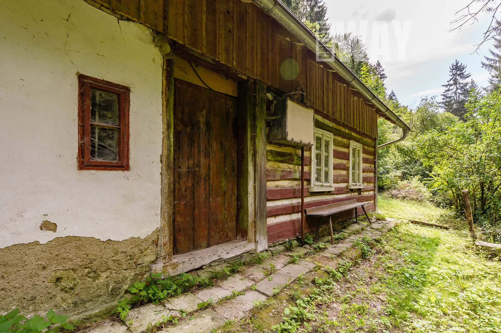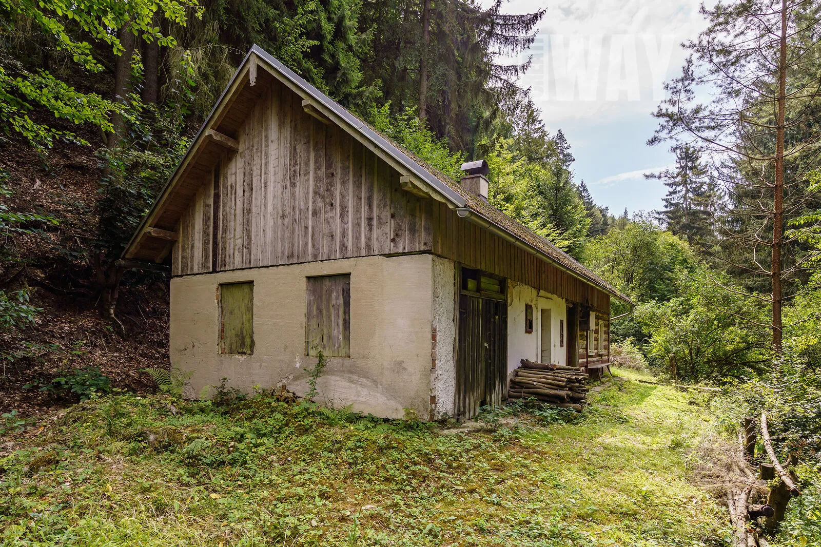 FAKT: Pozemek je z 90% zalesněný a svažitý. Součástí pozemku nejsou žádné louky, jediná mýtina je okolo roubenky.