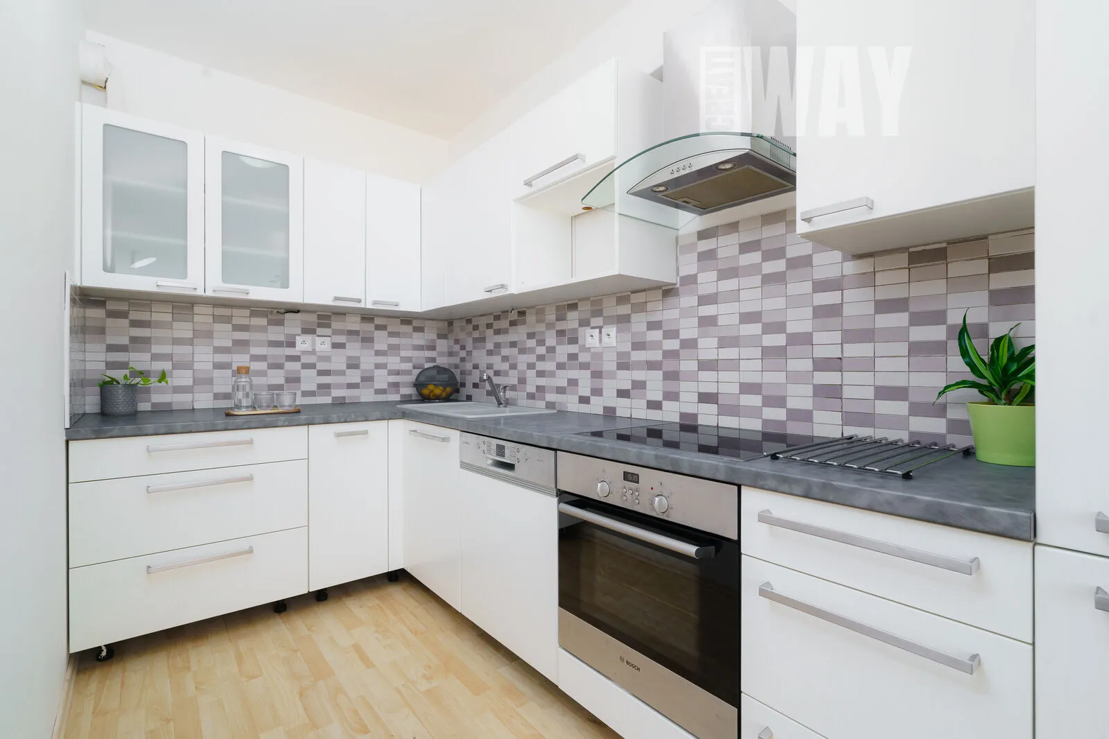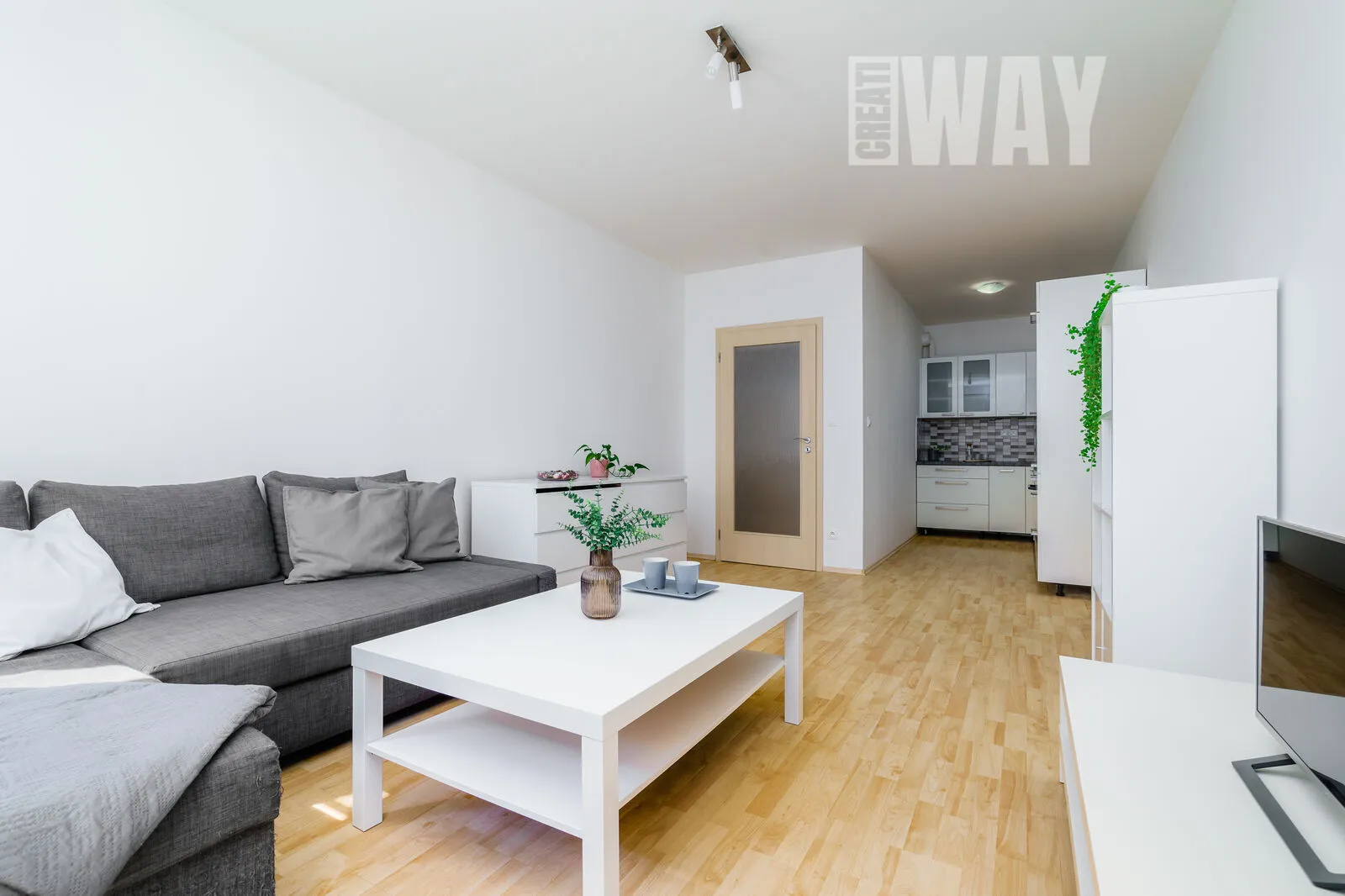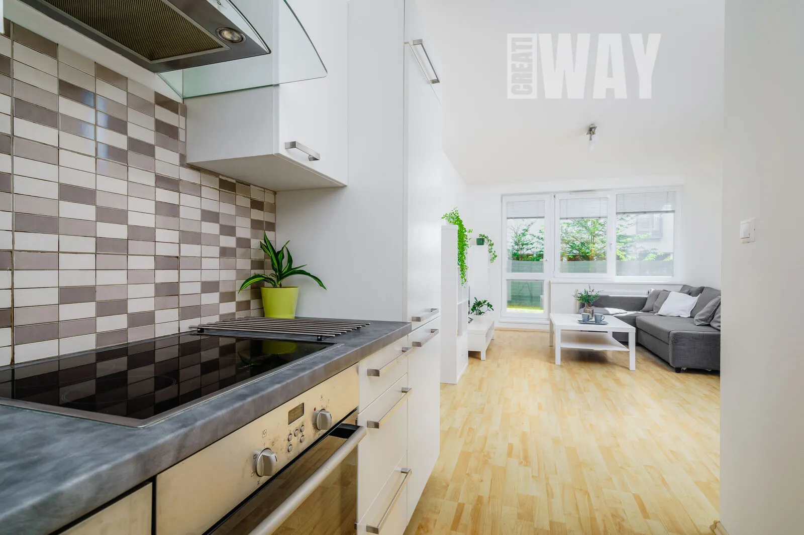 Obývací pokoj je prosvětlený a působí vzdušným dojmem díky velkým oknům, které dovolí slunci zaplnit celý prostor příjemným světlem. Kuchyňská linka v navazujícím kuchyňském koutě je tak velká, že by se za ni nemusely stydět ani dvakrát tak velké byty.