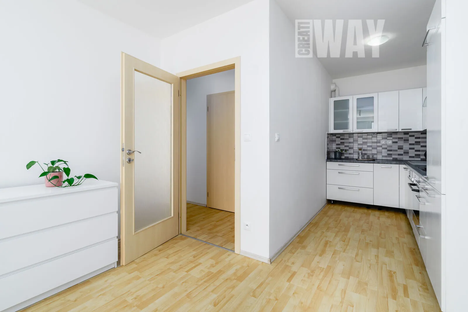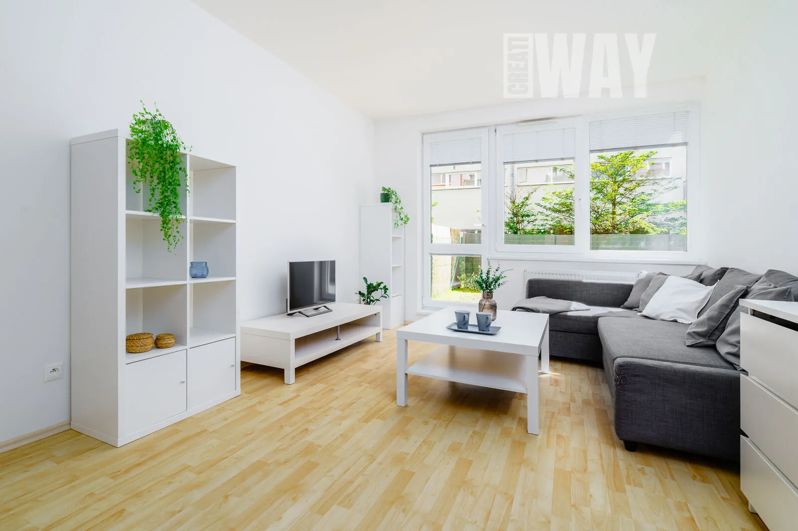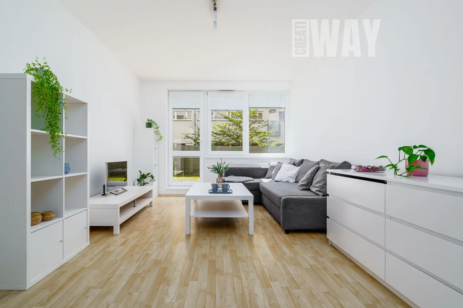 Obývací pokoj je prosvětlený a působí vzdušným dojmem díky velkým oknům, které dovolí slunci zaplnit celý prostor příjemným světlem. Kuchyňská linka v navazujícím kuchyňském koutě je tak velká, že by se za ni nemusely stydět ani dvakrát tak velké byty.