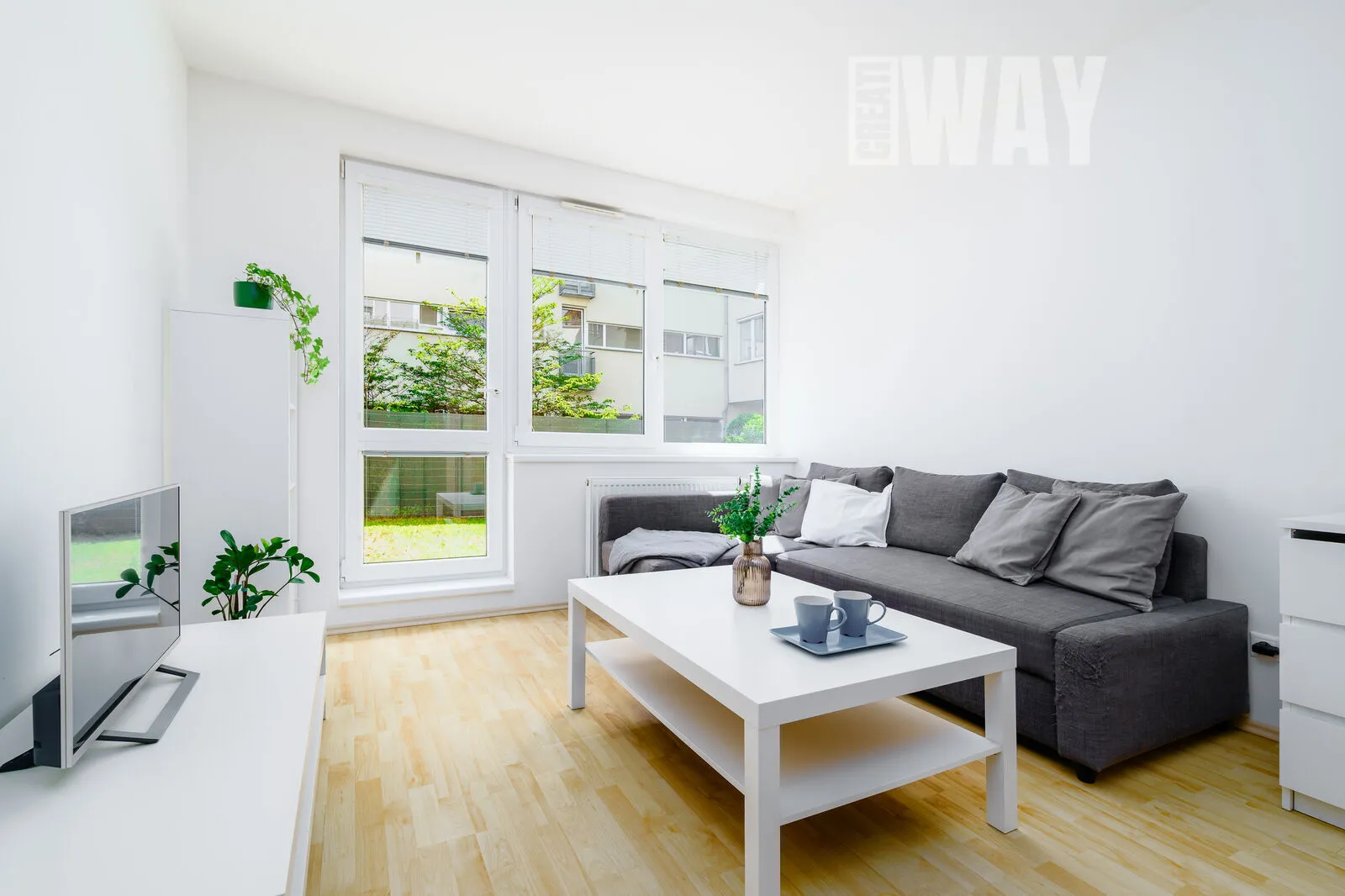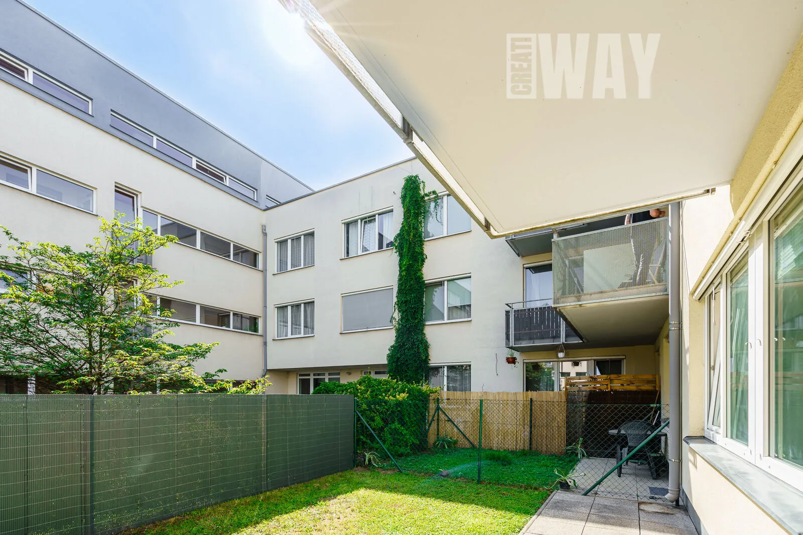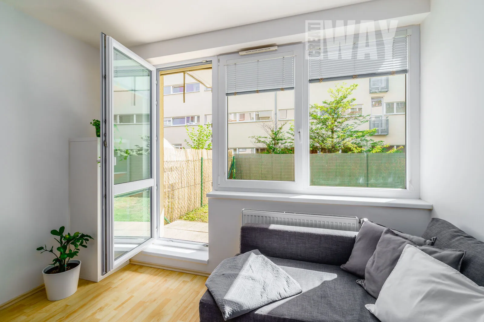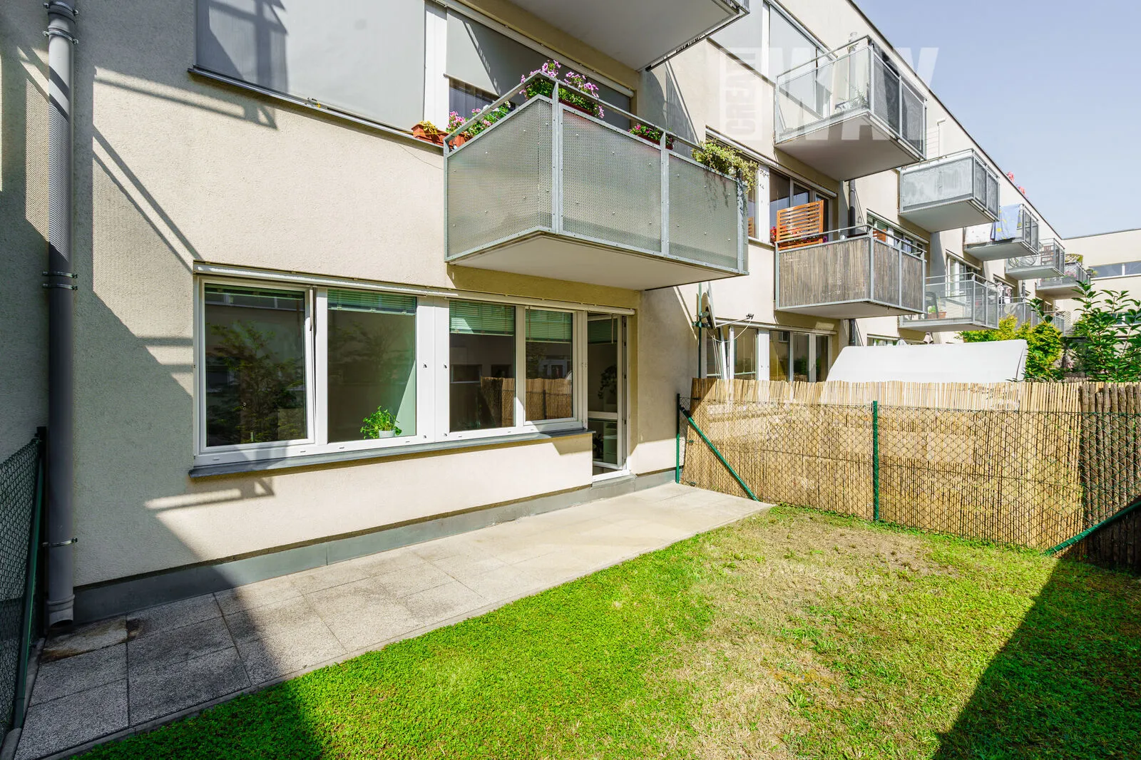 A to nejlepší? Z obývacího pokoje vstoupíte na vlastní terasu o rozloze 32 m², která je částečně zatravněná a částečně dlážděná. Ideální prostor pro letní grilování, odpolední siestu s knihou nebo prostě jen lempling a užívání si čerstvého vzduchu.