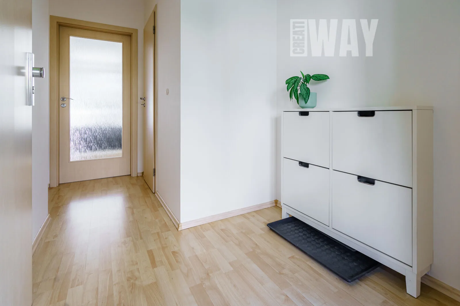 Z předsíně vedou ještě jedny dveře a když je otevřete, najdete za nimi praktickou komoru. Dveře se otevírají ven, takže až do ní budete cpát vánoční stromeček a nafukovací člun, můžete je pohodně přirazit ramenem. Počkat? Vlastně nemusíte, protože venku je ještě sklep, kam všechny tyhle věci v pohodě dáte. Do komory tedy jen prkno na žehlení a zavařovačky.
