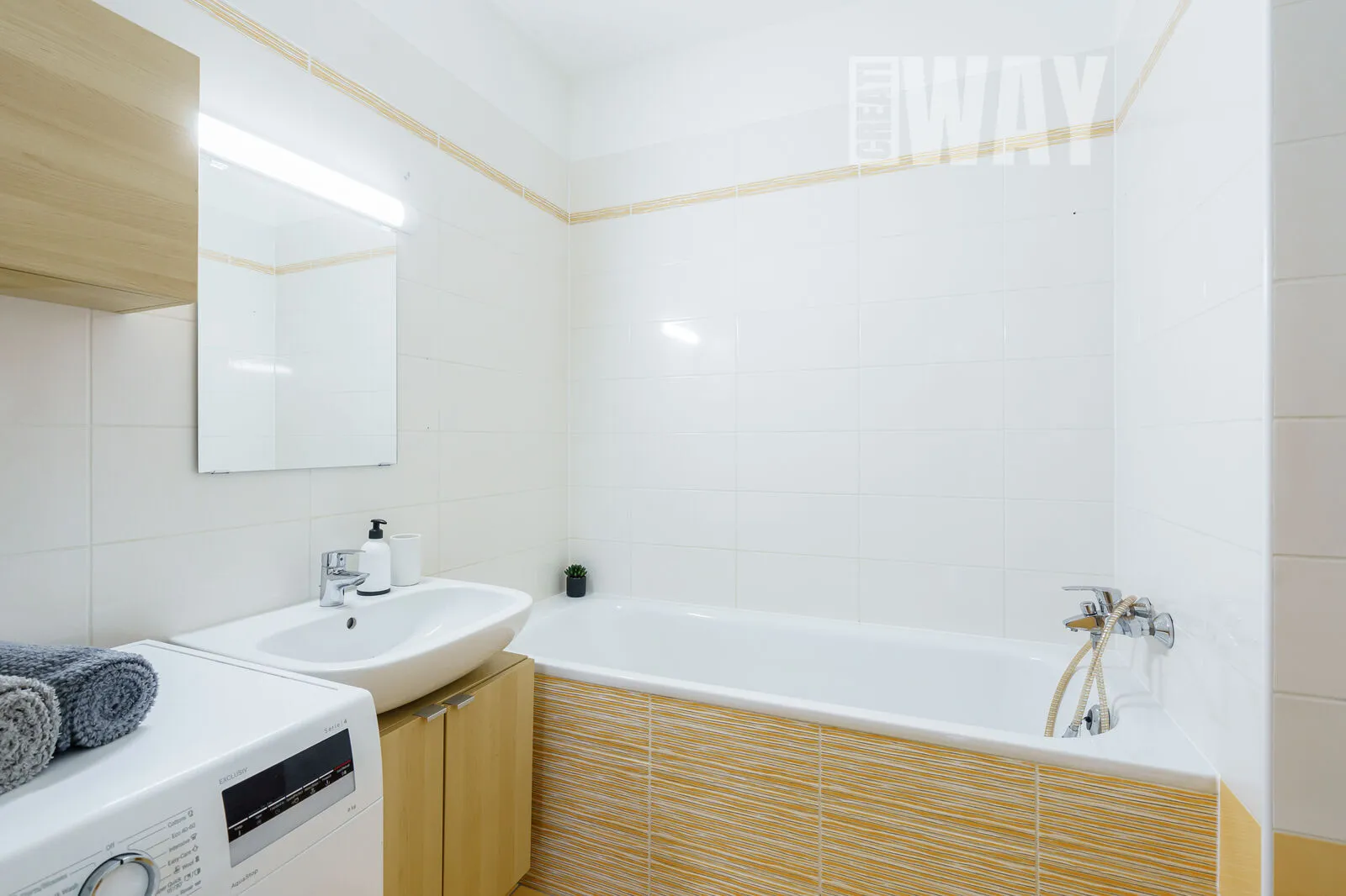 Koupelna nabízí veškerý komfort, který od ní očekáváte – od prostorné vany až po prostor na pračku.